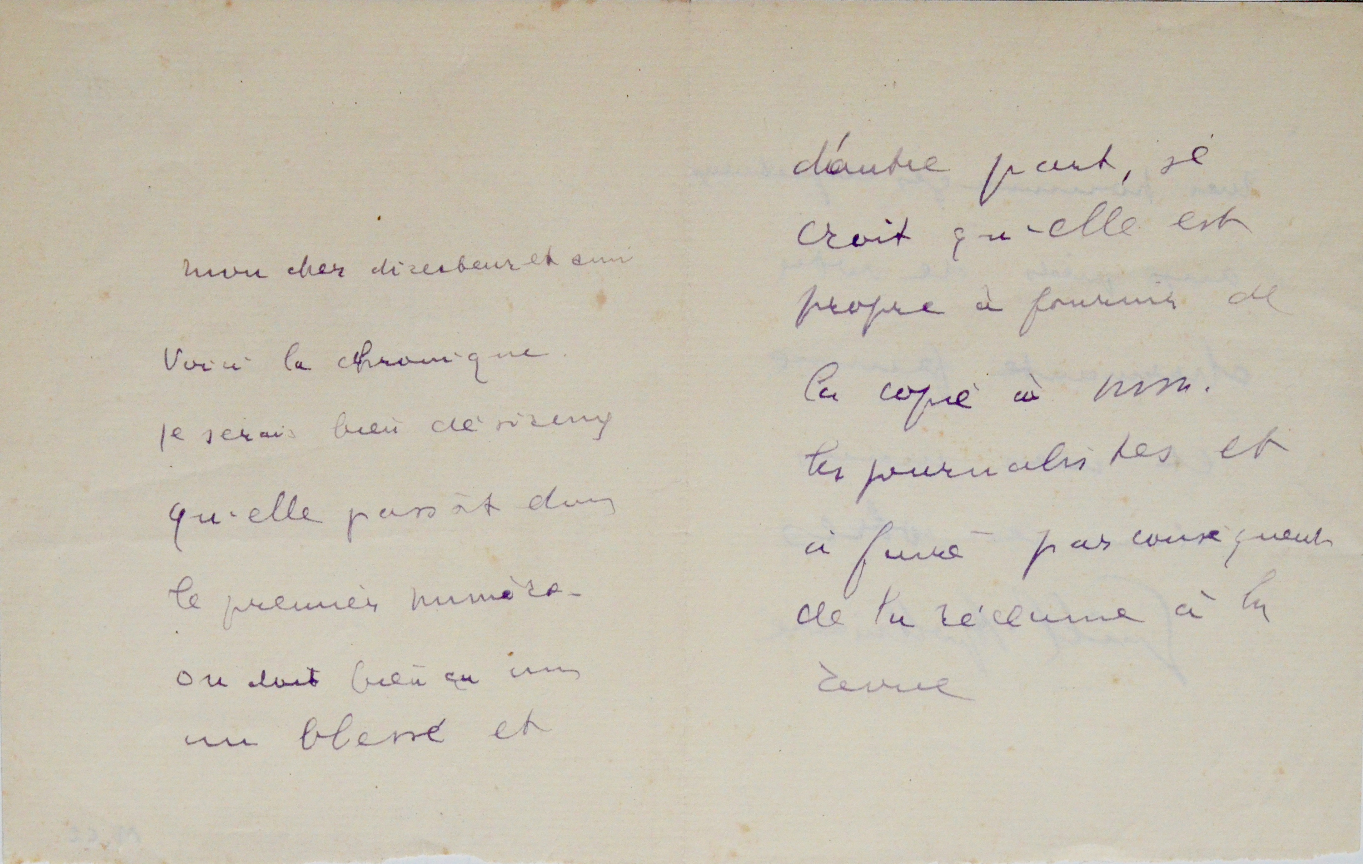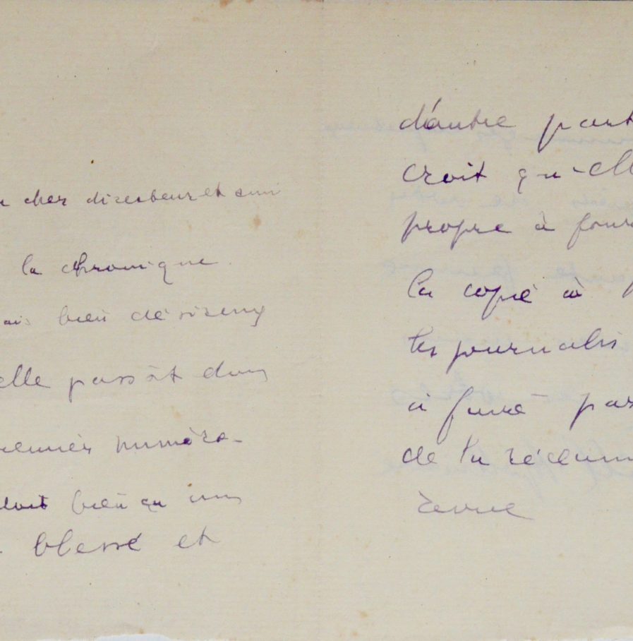 Guillaume Apollinaire rend un article. "Voici la chronique. Je serais bien désireux qu'elle passât dans le premier numéro. On doit bien ça à un blessé et d'autre part, je crois qu'elle est propre à fournir de la copie à MM. les journalistes et à faire par conséquent de la réclame à la revue [...]".