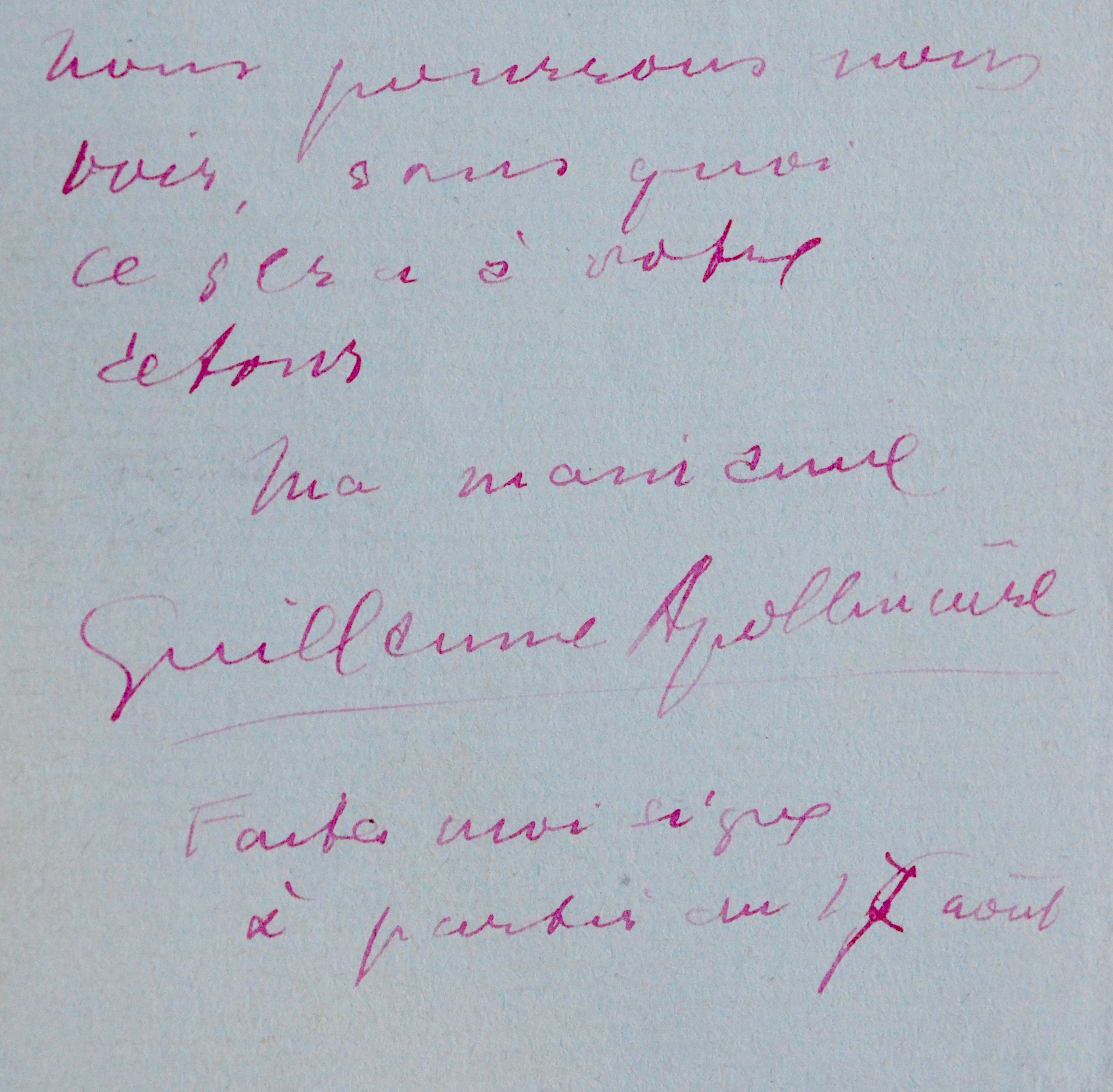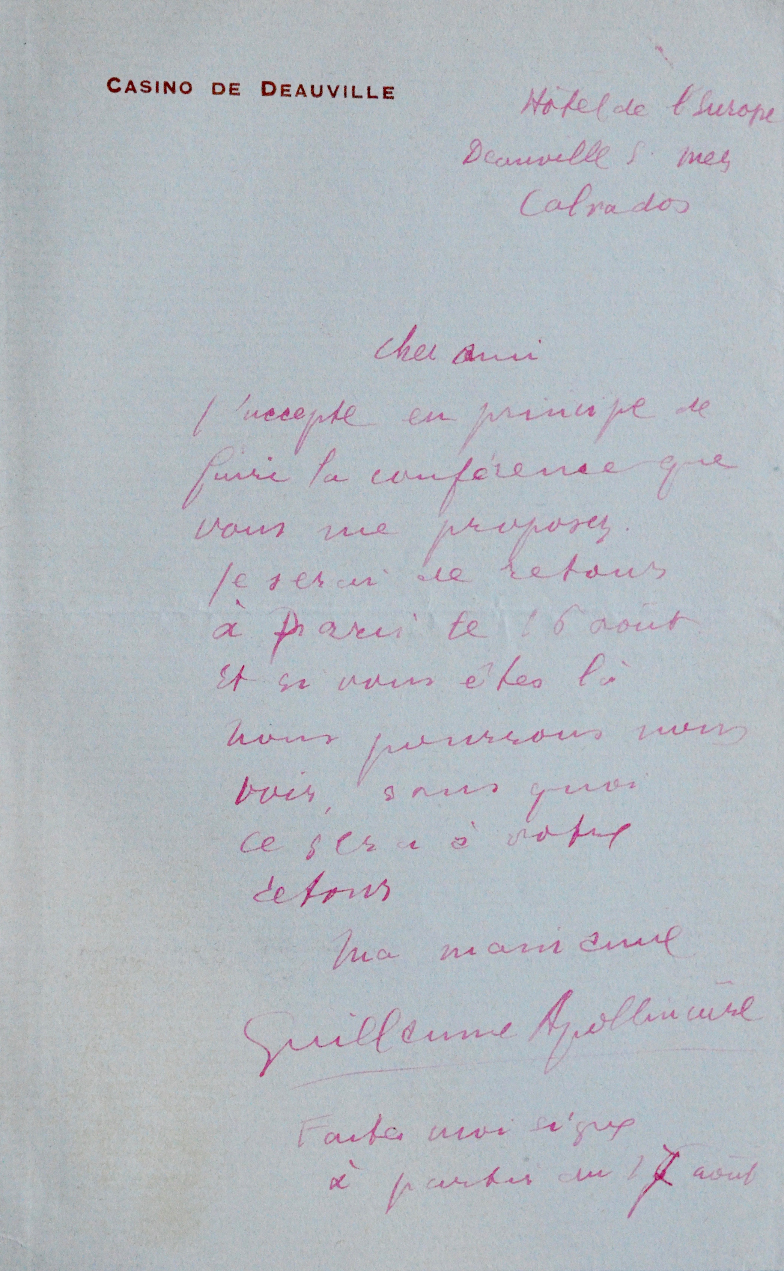 "Cher ami. J'accepte en principe de faire la conférence que vous me proposez. Je serai de retour à Paris le 16 août et si vous êtes là nous pourrons nous voir, sans quoi ce sera à votre retour. Ma main amie [...]". Apollinaire ajoute "Faites moi signe à partir du 17 août".