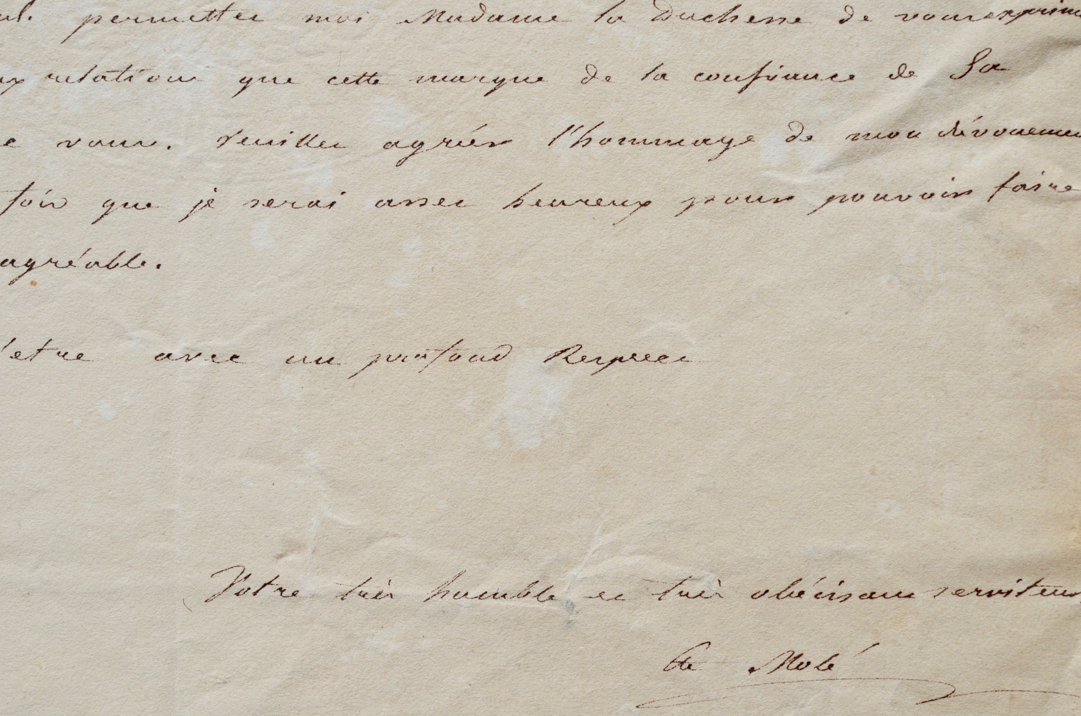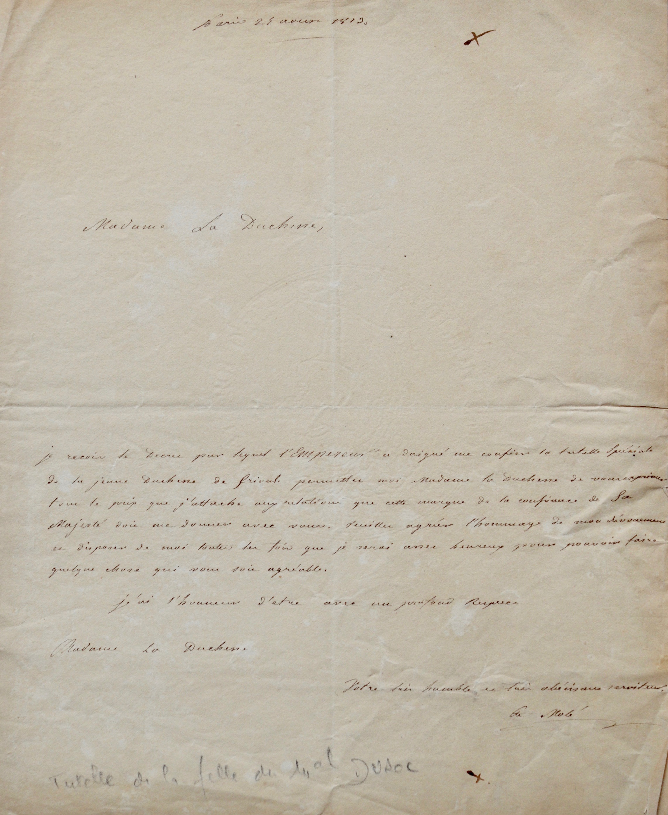 Louis Mathieu Molé (comte) (Paris, 1781/1855)Après la mort de Duroc, duc de Frioul, tombé au champ d'honneur à la bataille de Bautzen (Saxe) le 22 mai 1813. "Je reçois le décret par lequel l'Empereur a daigné me confier la tutelle spéciale de la jeune duchesse de Frioul [Hortense Eugénie Marie-des-Neiges de Michel du Roc (14 mai 1812 – 24 septembre 1829)]. Permettez-moi Madame la Duchesse de vous exprimer tout le prix que j'attache aux relations que cette marque de la confiance de Sa Majesté doit me donner avec vous. Veuillez agréer l'hommage de mon dévouement et disposer de moi toutes les fois que je serai assez heureux pour pouvoir faire quelque chose qui vous soit agréable".