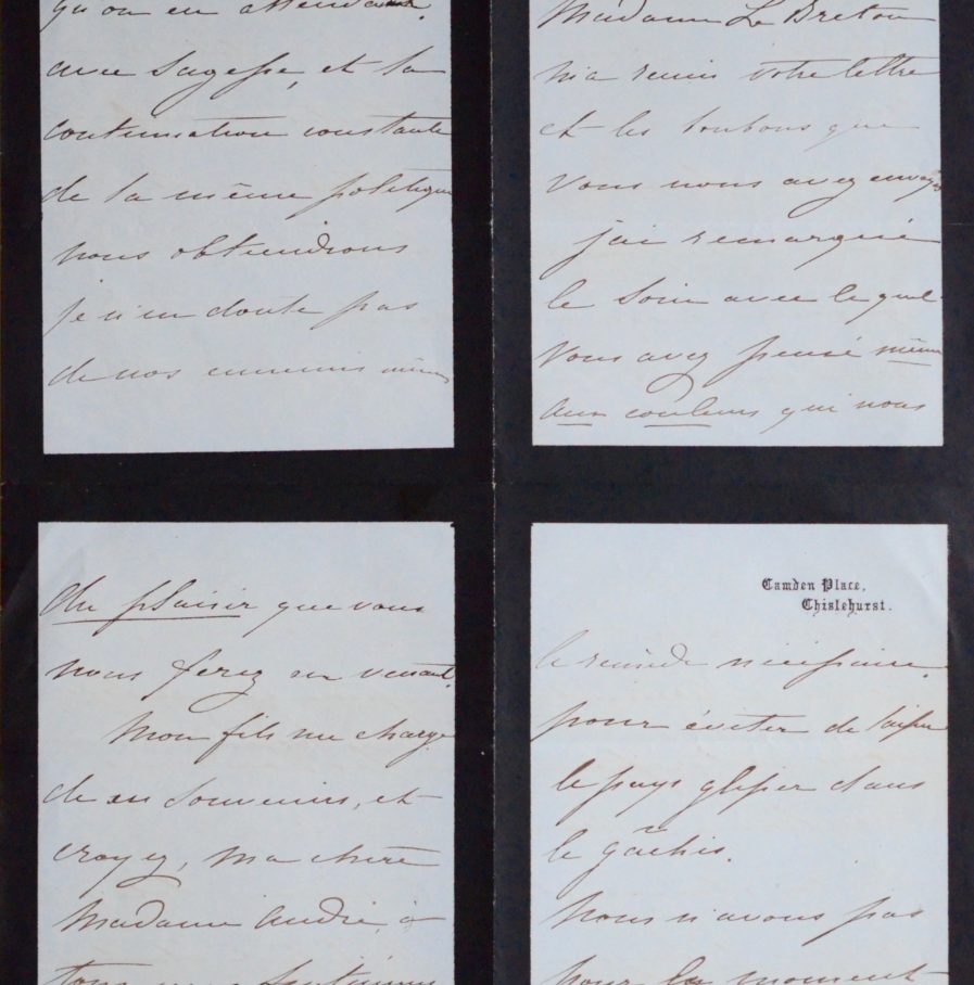 Eugénie de Montijo (Grenade, 1826/1920)Longue lettre de l'impératrice Eugénie, rédigée sur papier de deuil, l'année de la mort de Napoléon III, à Chislehurst. Elle adresse ses remerciements à Madame André et l'informe que Madame Lebreton-Bourbaki lui a transmis sa lettre et ses bonbons. "Vous avez pensé même aux couleurs qui nous étaient agréables ; et mon goût pour la laque de Chine, c'est à dire que même dans les détails, vous pensez à nous". Elle est inquiète : "Nous allons bientôt commencer une autre année, les tristes et ineffaçables impressions que celle qui se termine nous a laissée sont bien vives, et c'est toujours avec un sentiment d'inquiétude que mes pensées se portent sur l'avenir [...]".