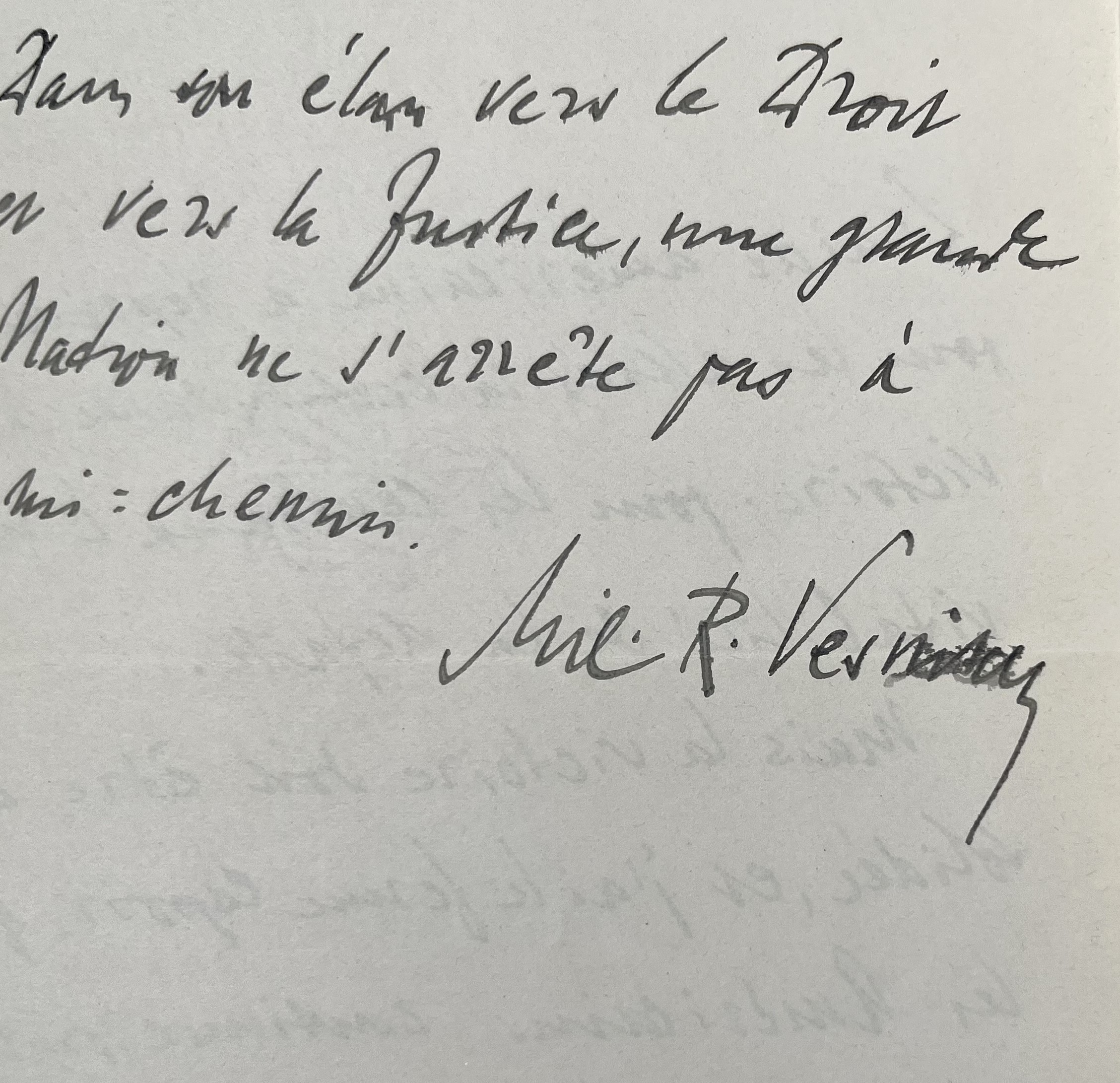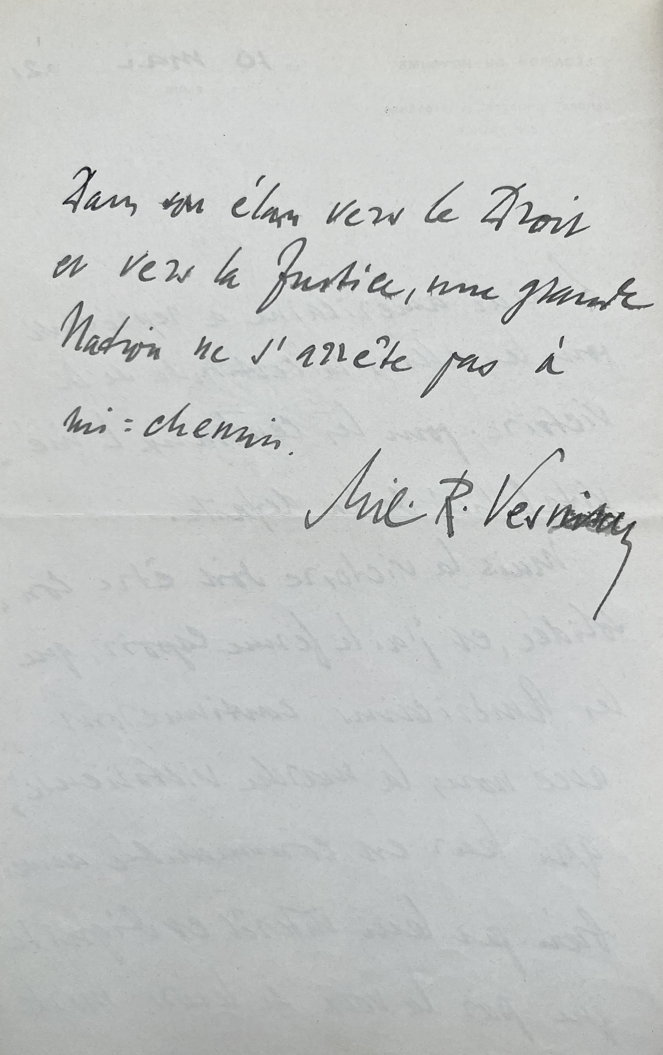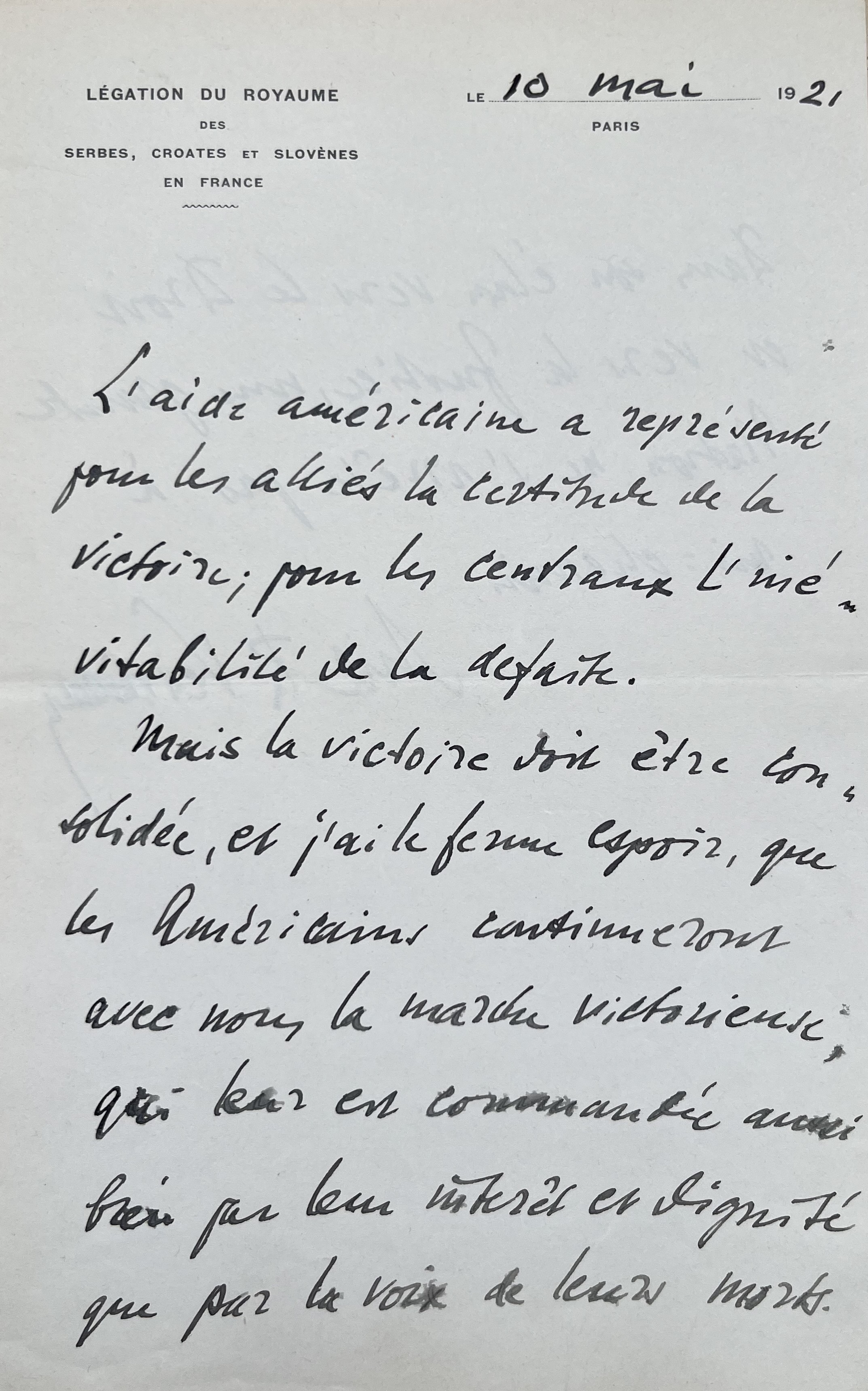 « L’aide américaine a représenté pour les alliés la certitude de la victoire ; pour les centraux l’inévitabilité de la défaite. Mais la victoire doit être consolidée, et j’ai le ferme espoir, que les Américains continueront avec nous la marche victorieuse, qui leur est commandée aussi bien par leur intérêt et dignité que par la voix de leurs morts. Dans son élan vers le Droit et vers la Justice, une grande Nation ne s’arrête pas à mi-chemin. Mil. R. Vesnitch ».