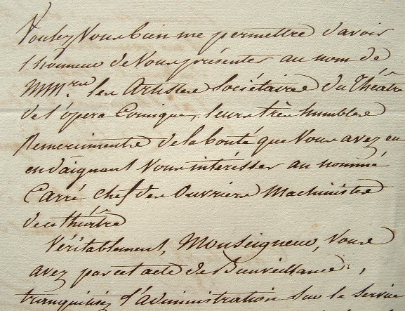 Lettre de Lesage qui, au nom des sociétaires du Théâtre de l'Opéra comique, remercie Junot pour son intervention en faveur du machiniste Carré. «Véritablement, monseigneur, vous avez par cet acte de bienveillance, tranquillisé l'administration sur le service du méchanisme [sic] de ce théâtre sur lequel ils étoient d'autant plus inquiets que le cruel accident arrivé dernièrement à Mde Aubry leur rendait Carré plus nécessaire, attendu que ce chef d'ouvriers entend très bien sa partie». [La grande actrice égérie de l'Empire Angélique Thérèse Aubry (1772/1829) fut victime d'un terrible accident lors d'une représentation du ballet Le Retour d'Ulysse : la "gloire" ; la machine sur laquelle elle descendait s'effondra, la blessant grièvement ; le tout-Paris s'intéressa à son sort et l'impératrice Joséphine, qui assistait à la représentation, fit donner, aux Tuileries, une représentation à son bénéfice].
