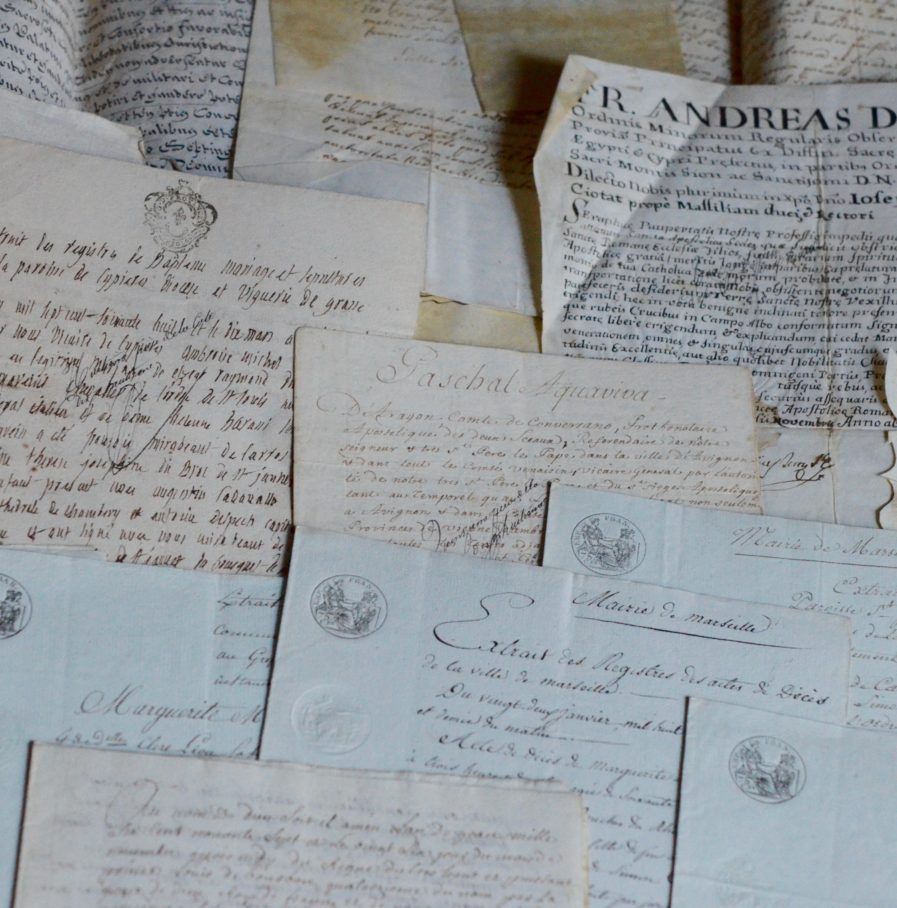 Bel et rare ensemble de 13 documents, sur parchemin ou sur papier, du XVIIIe. siècle Ils concernant messire Simon de Cauvin et sa famille, originaire de La Roque-d'Antéron, en particulier l'octroi du titre de Comte Palatin, par le pape Benoit XIV.