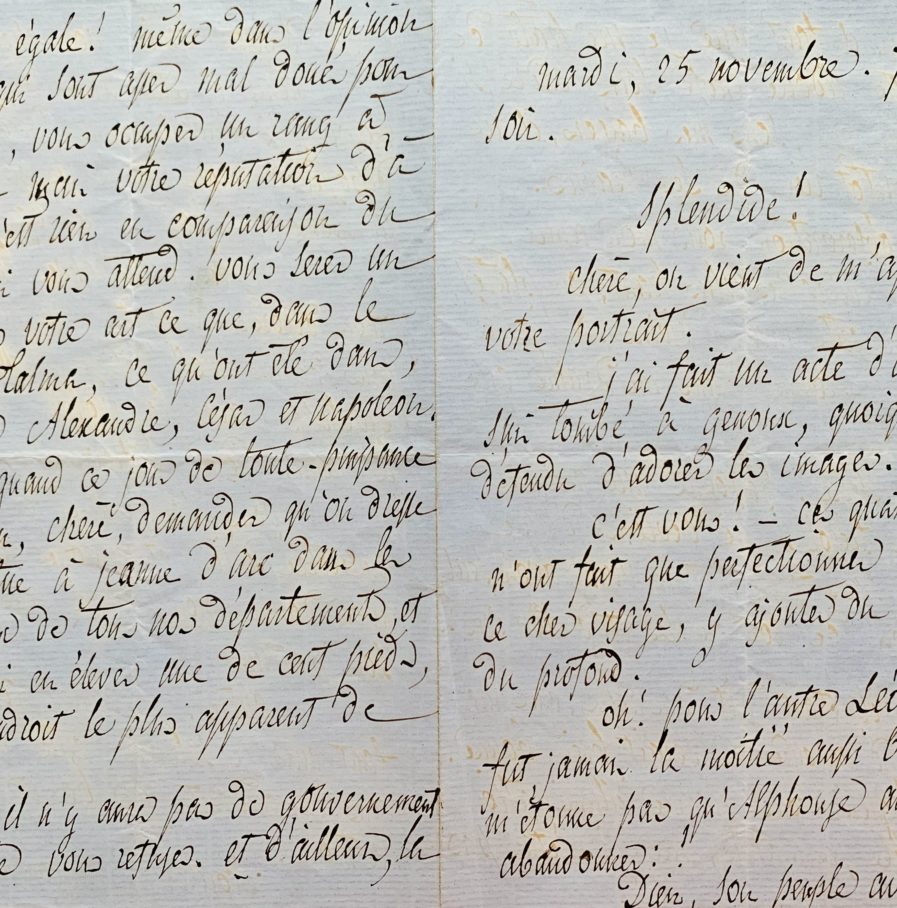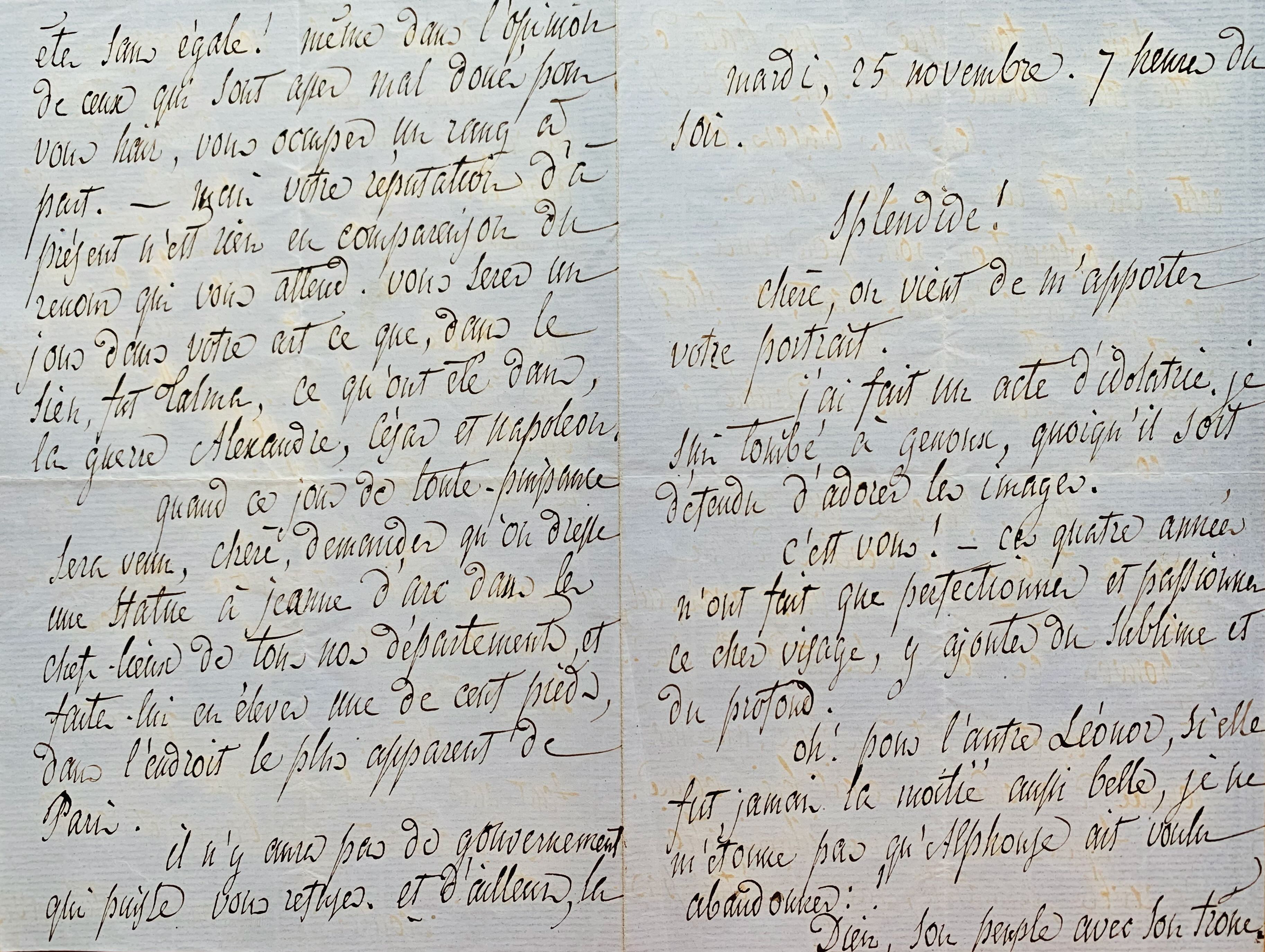 "Splendide! Chère, on vient de m'apporter votre portrait. J'ai fait un acte d'idolâtrie. Je suis tombé, à genoux, quoi qu'il soit défendu d'adorer les images.
