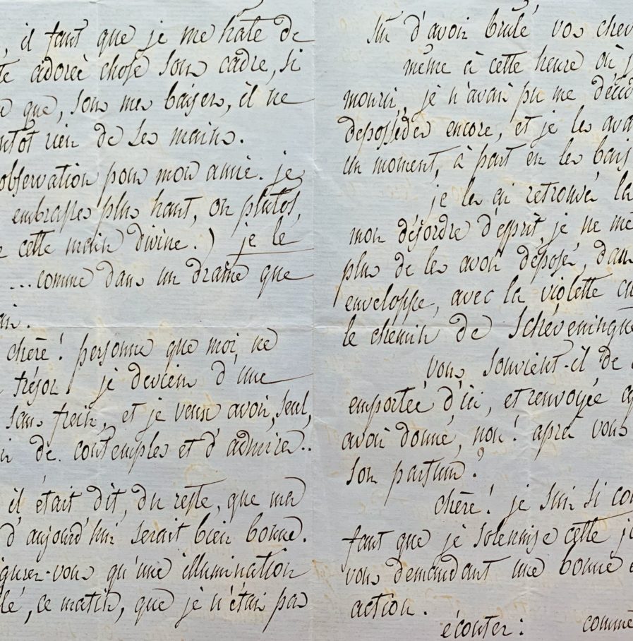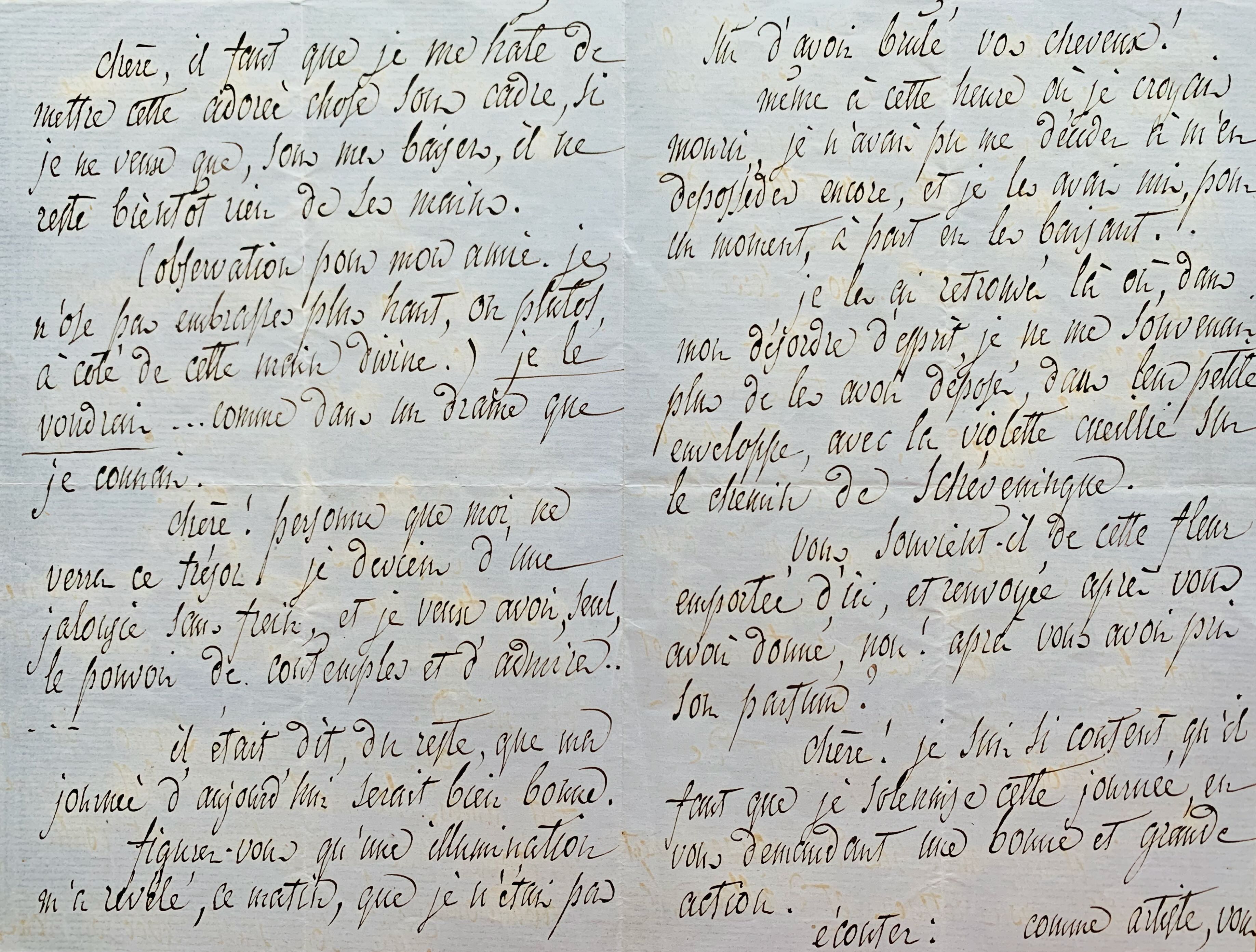 Chère, personne que moi ne verra ce trésor, je deviens d'une jalousie sans frein, et je veux avoir, seul, le pouvoir de contempler et d'admirer... Il était dit, du reste, que ma journée d'aujourd'hui serait bien bonne. Figurez-vous qu'une illumination m'a révélé, ce matin, que je n'étais pas sûr d'avoir brûlé vos cheveux! Même à cette heure où je croyais mourir, je n'avais pu me décider à m'en déposséder encore, et je les avais mis, pour un moment, à part en les baisant. Je les ai retrouvés là où, dans mon désordre d'esprit, je ne me souvenais plus de les avoir déposés, dans leur petite enveloppe, avec la violette cueillie sur le chemin de Schéveningue [à côté de La Haye]. Vous souvient-il de cette fleur emportée d'ici, et renvoyée après vous avoir donné, non! après vous avoir pris son parfum?
