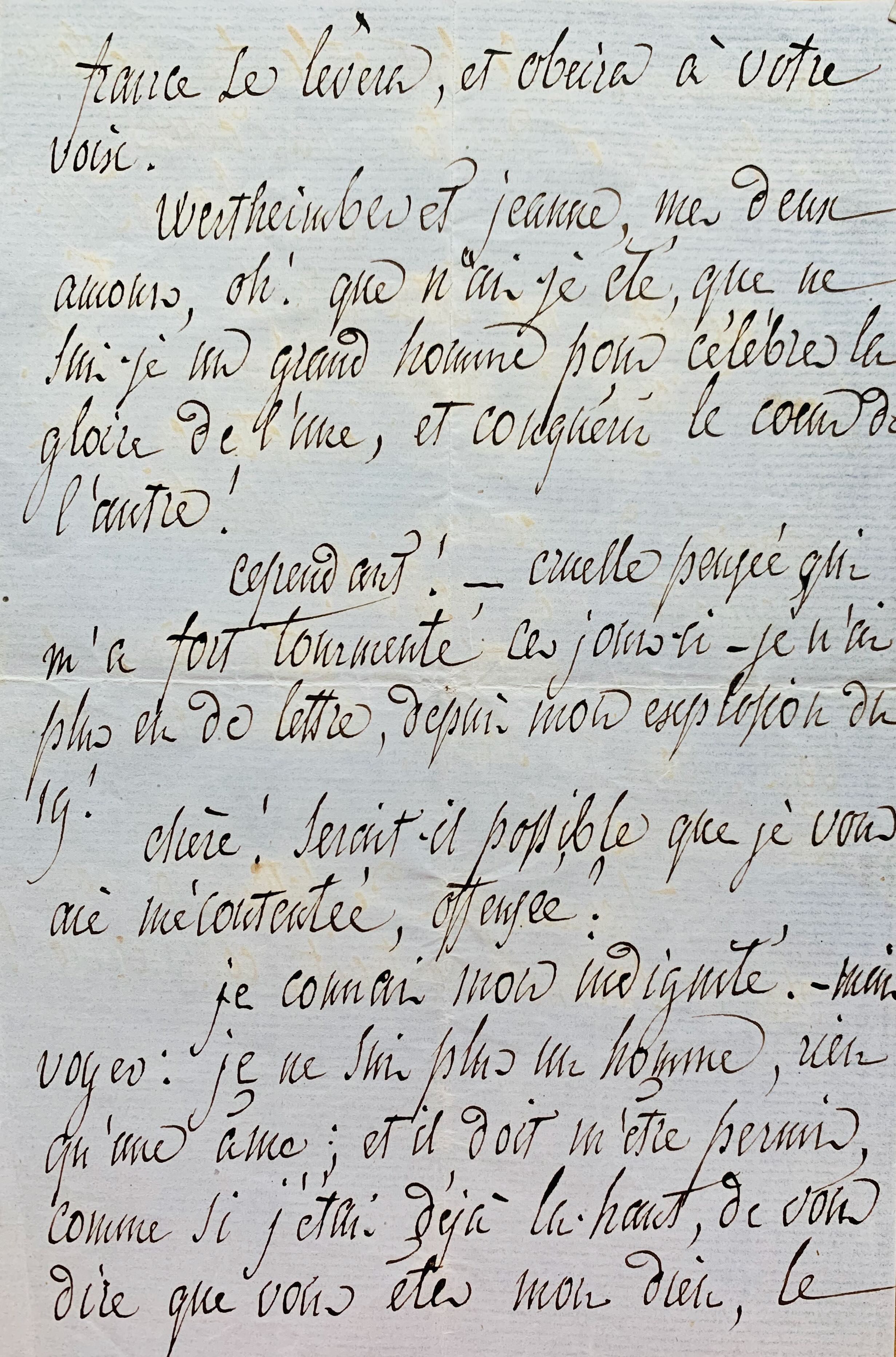 C'est vous! - ces quatre années n'ont fait que perfectionner et passionner ce cher visage, y ajouter du sublime et du profond [...]. Chère, il faut que je me hâte de mettre cette adorée chose sous cadre, si je ne veux que, sous mes baisers, il ne reste bientôt rien de ses mains. (Observation pour mon amie. Je n'ose pas embrasser plus haut, ou plutôt, à côte de cette main divine.) Je le voudrais... comme dans un drame que je connais.