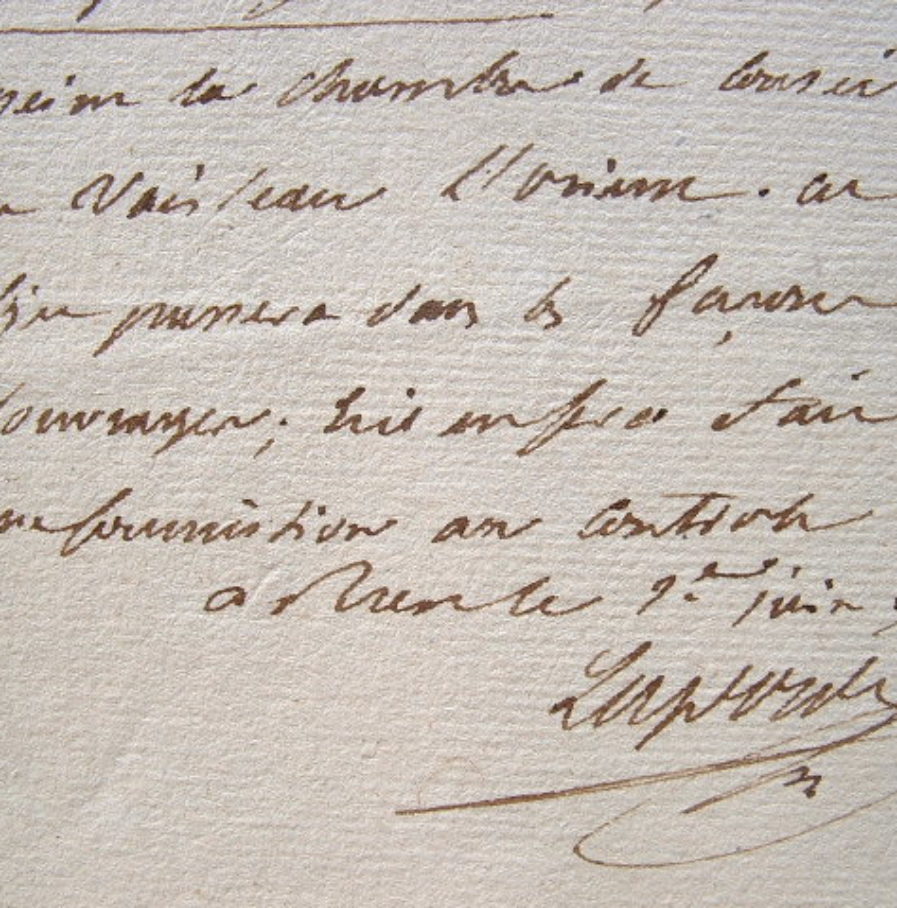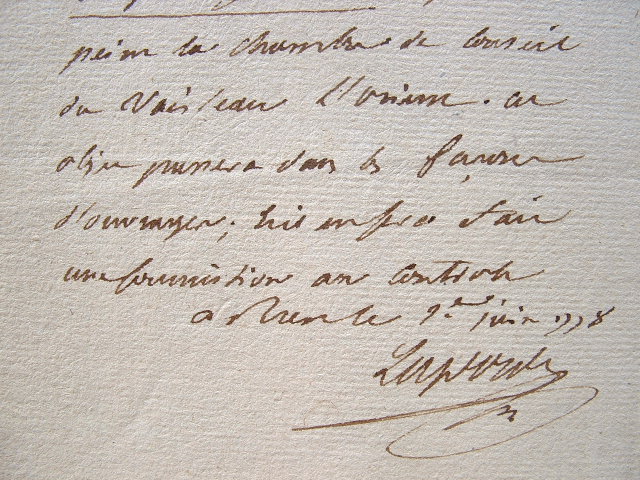 Arnaud de Laporte, alors intendant du port de Brest, donne ordre à son correspondant de payer au peintre Audemar la somme de 96 livres «pour avoir peint la chambre du Conseil du vaisseau l'Orient». Il précise où devront être pris les fonds. [Le vaisseau l'Orient, l'un des fleurons de la flotte française, fait naufrage en septembre 1782, durant la campagne des Indes].