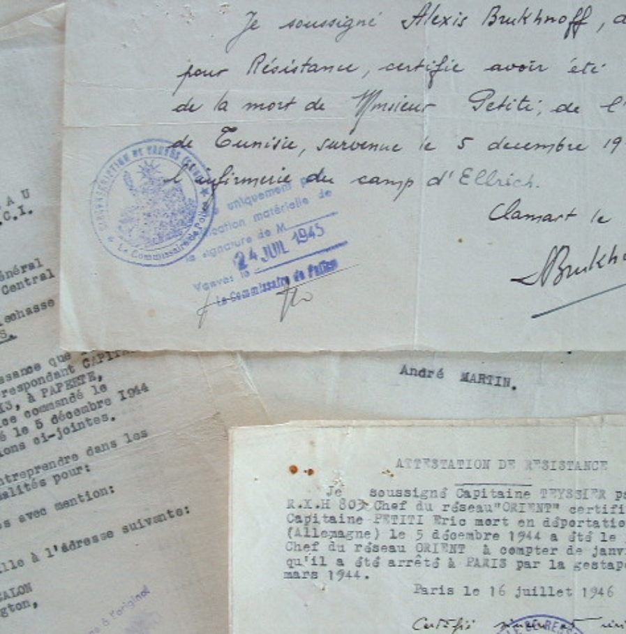 Dossier relatif à l'arrestation, la déportation et le décès du capitaine Eric Petiti, chef du réseau "Orient", natif de Tahiti. Il comporte essentiellement des états de service, certificats et témoignages d'arrestation par la gestapo, déportation et décès au camp de Elleich. Parmi les documents figurent un témoignage manuscrit d'Alexis Burkhnoff "déporté pour résistance" ; un certificat des Forces Françaises Combattantes signé par le colonel Garbey à Tunis ; une lettre dactylographiée signée par le commandant Brusset des F.F.L. (Alger, 9 novembre 1943) sur les missions réalisées par Petiti au sein des F.F.C. dès novembre 1942 ; une attestation de résistance signée par le capitaine Teyssier dit "Mékong", etc.