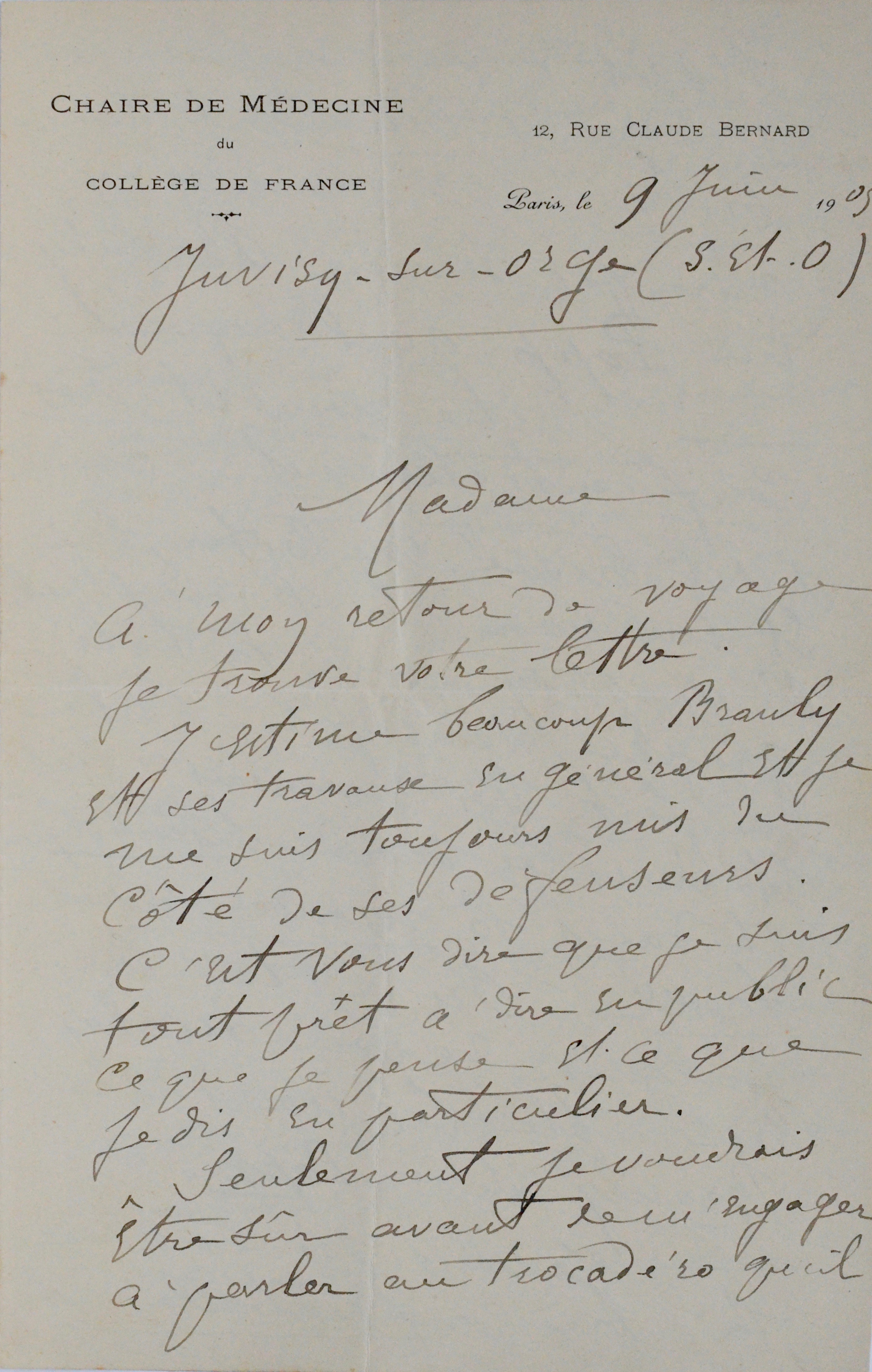 Papier à en-tête de la Chaire de Médecine du Collège de France.