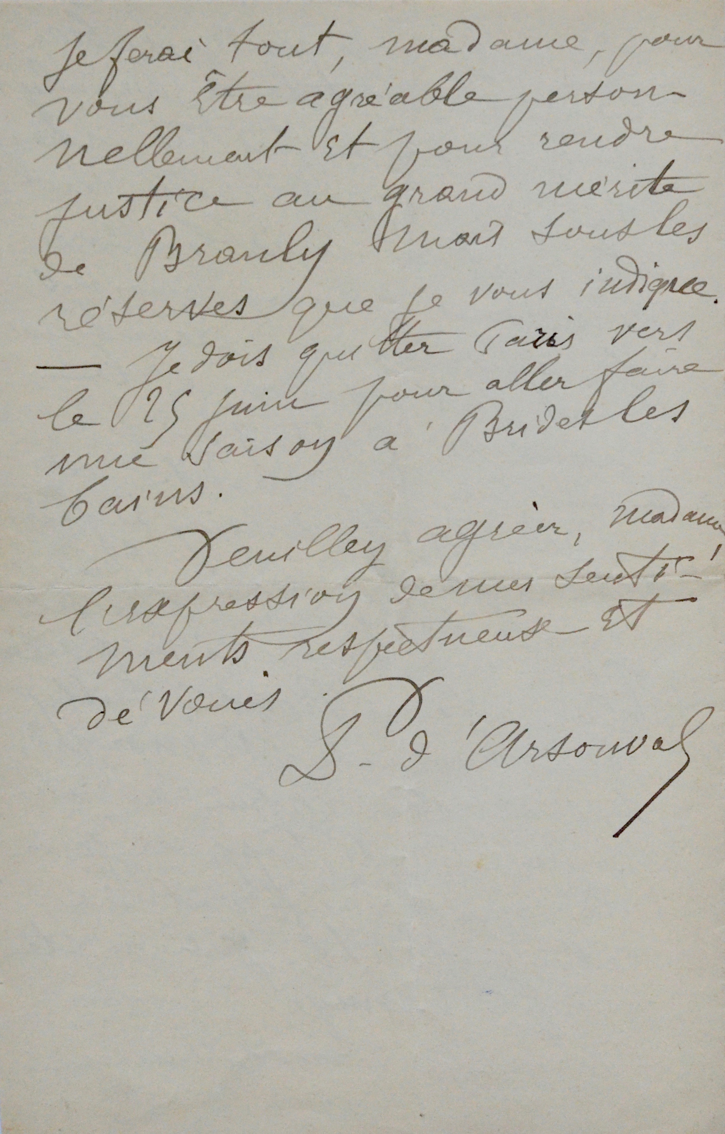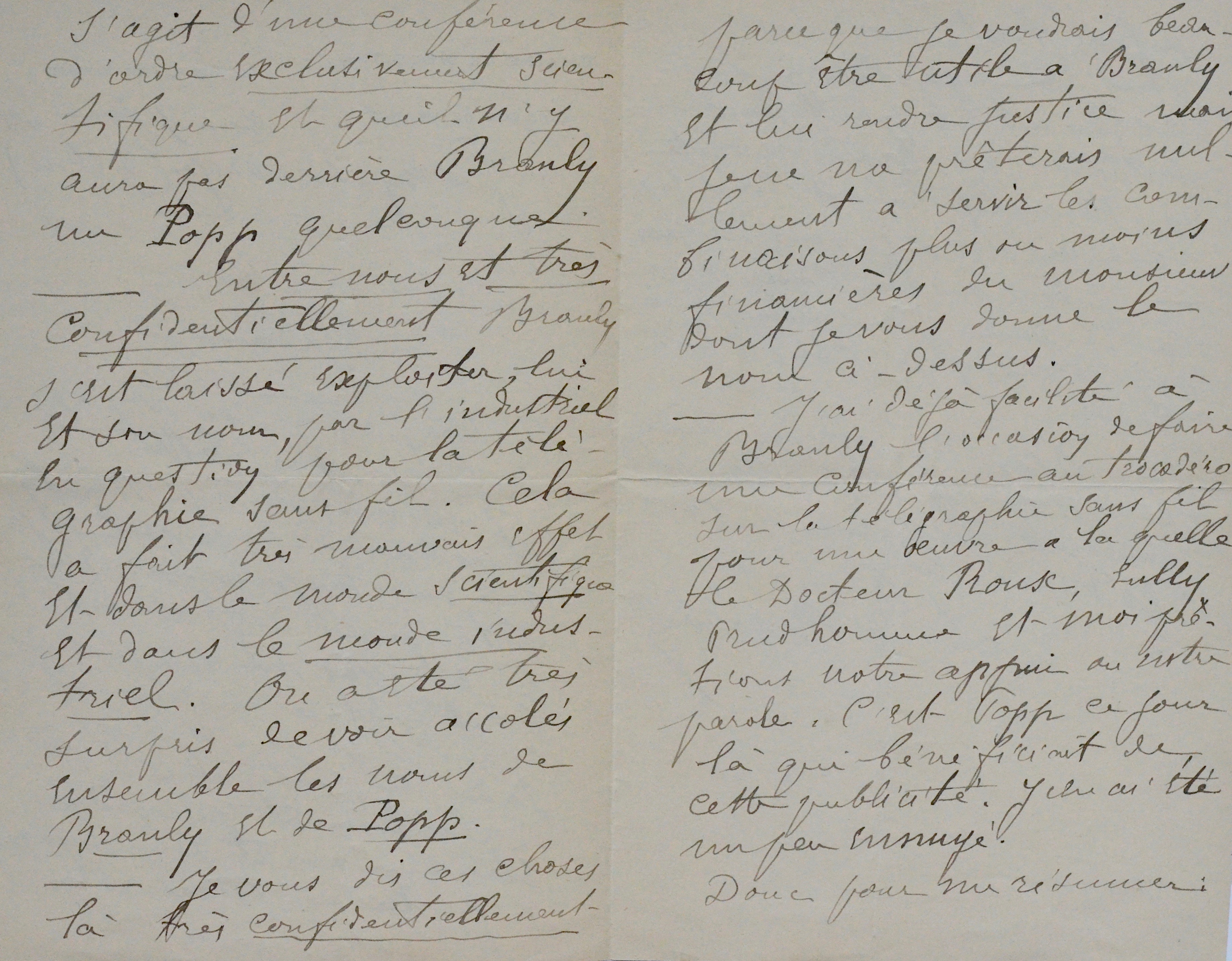 "[...] J'estime beaucoup Branly et ses travaux en général et je me suis toujours mis du côté de ses défenseurs. C'est vous dire que je suis tout prêt à dire en public ce que je pense et ce que je dis en particulier. Seulement je voudrais être sûr avant de m'engager à parler au Trocadéro qu'il s'agit d'une conférence d'ordre exclusivement scientifique et qu'il n'y aura pas derrière Branly un Popp quelconque. Entre nous et très confidentiellement Branly s'est laissé exploiter, lui et son nom, par l'industriel en question pour la télégraphie sans fil. Cela a fait très mauvais effet et dans le monde scientifique et dans le monde industriel. On a été très surpris de voir accolés ensemble les noms de Branly et de Popp. Je vous dis ça très confidentiellement parce que je voudrais beaucoup être utile à Branly. Et lui rendre justice [...]".