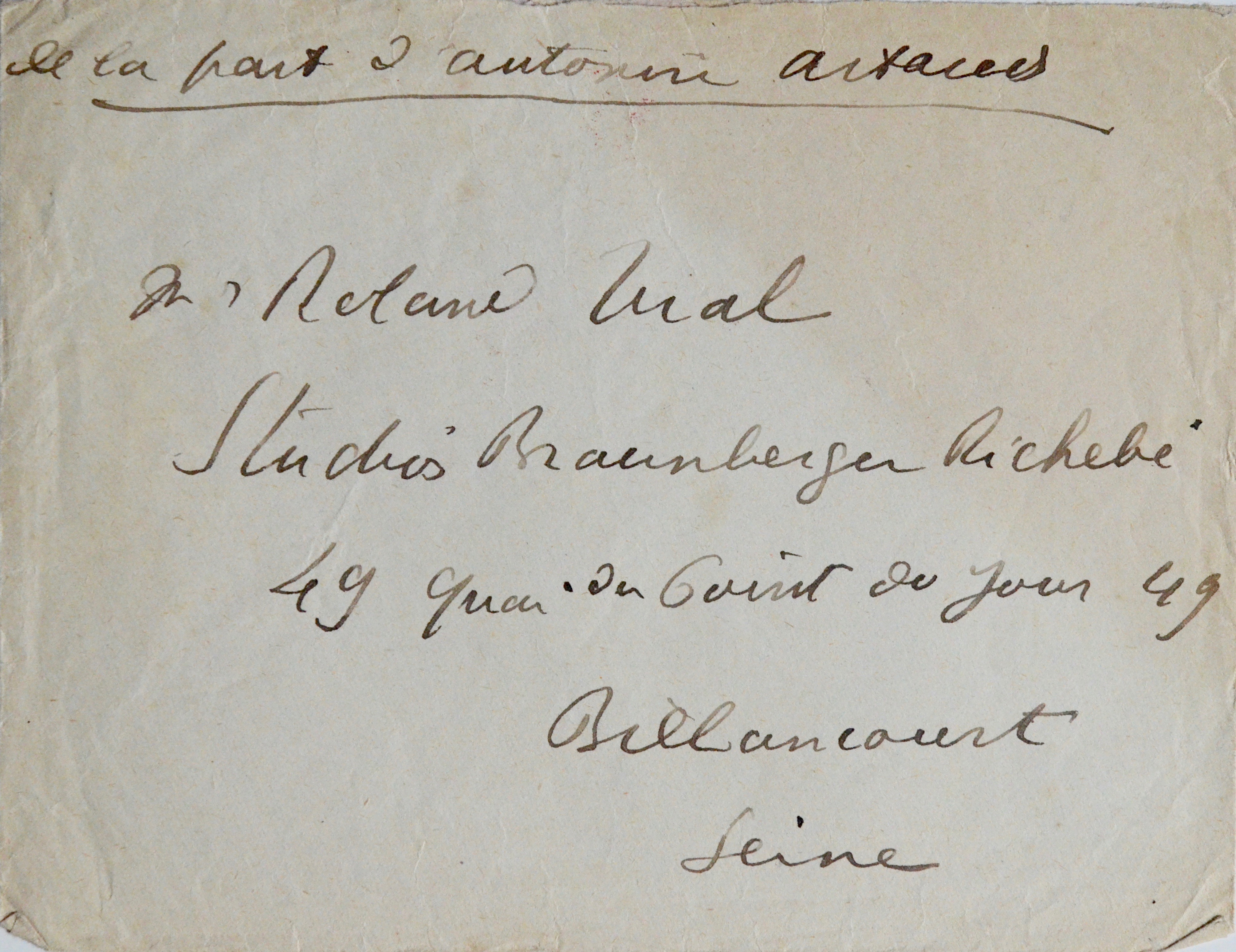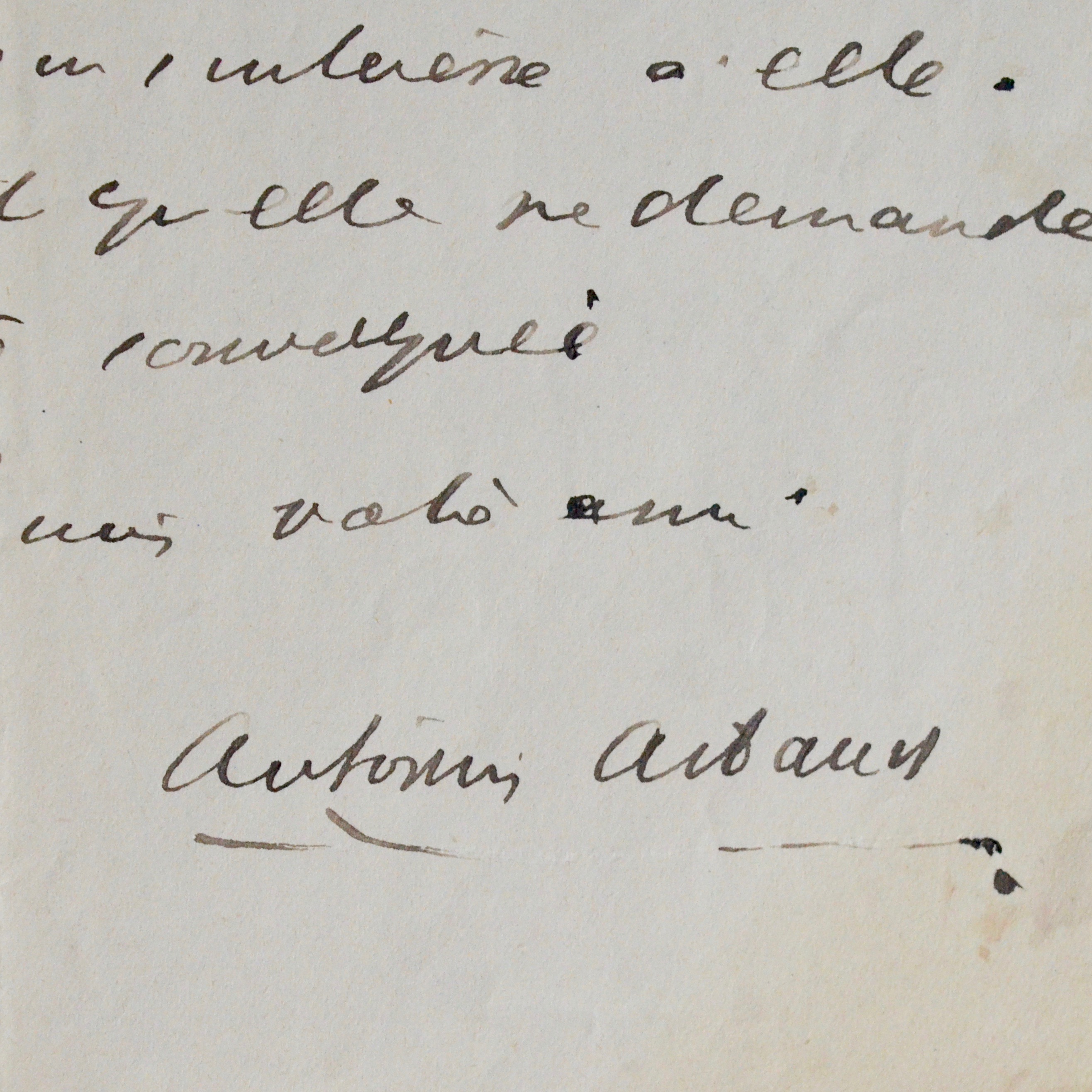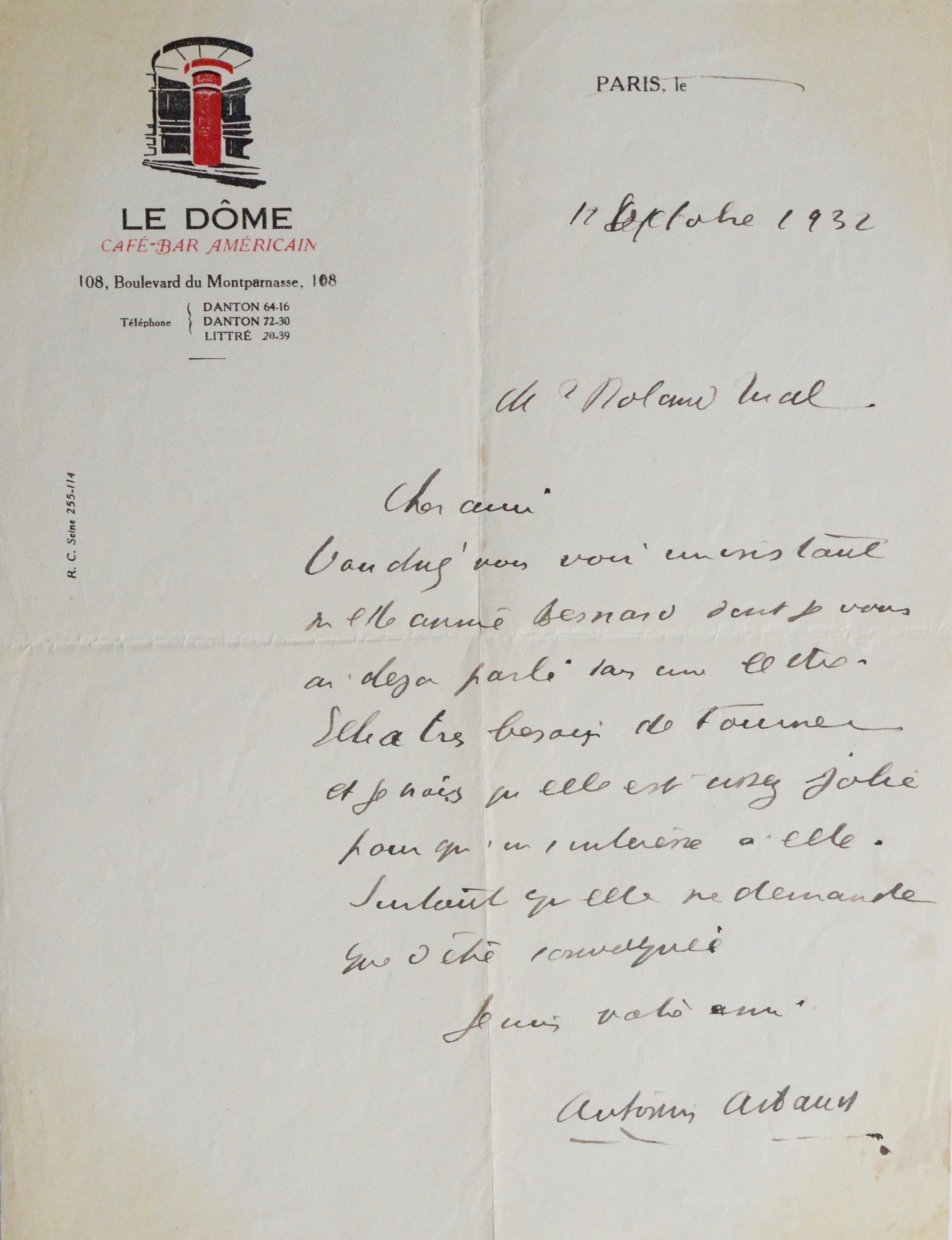Antonin Artaud (Marseille, 1896/1948)Antonin Artaud recommande sa maîtresse, Annie Besnard, au producteur de cinéma et réalisateur Roland Tual : "[...] Voudriez-vous voir un instant Melle Annie Besnard dont je vous ai déjà parlé dans une lettre. Elle a très besoin de tourner et je sais qu'elle est assez jolie pour qu'on s'intéresse à elle. Surtout qu'elle ne demande que d'être convoquée [...]".