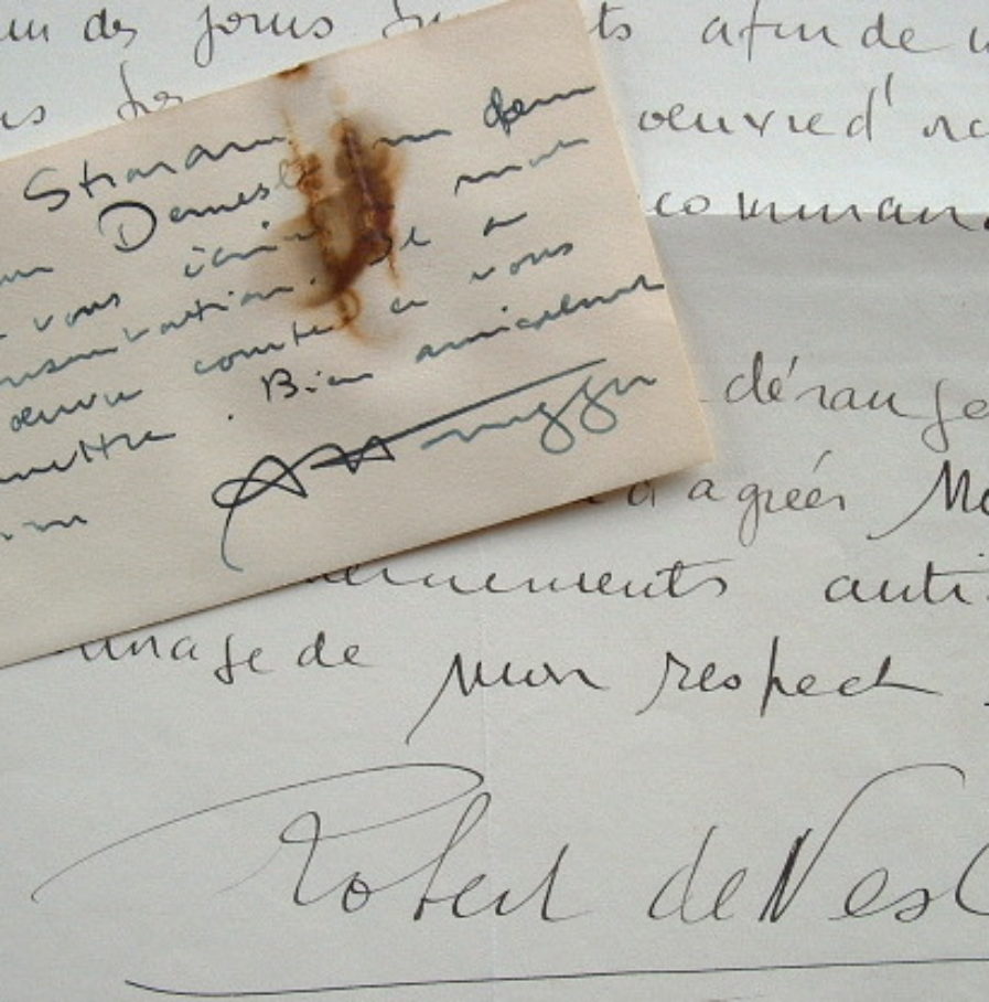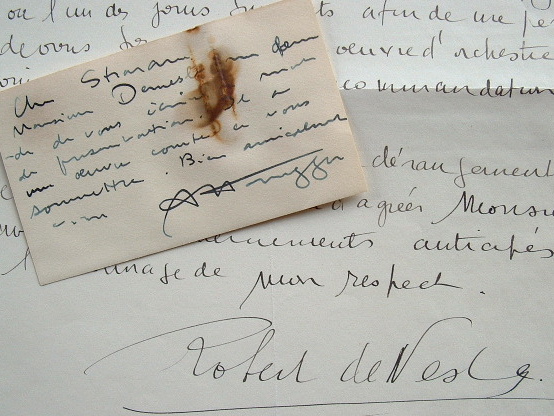Au dos de sa carte de visite, Arthur Honegger écrit quelques mots de présentation de son ami le compositeur Robert de Nesle qui a «une oeuvre courte à vous soumettre». Avec la lettre de Robert de Nesle demandant à rencontrer Walther Straram pour lui soumettre une oeuvre d'orchestre.