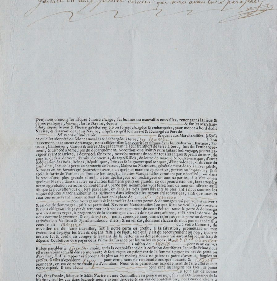 Pour des caisses de café, destinées à être chargées à Jacmel [Saint-Domingue] sur Le Philanthrope, navire négrier, conduit par le capitaine Barbet et à destination du Havre, contre les pertes, avaries simples ou grosses, abandon, périls de mer, guerre, feu, vent, ennemis, représailles, etc. Le total de l'assurance s'élève à 3 % de la valeur des biens, eux même s'élevant à 6000 livres.