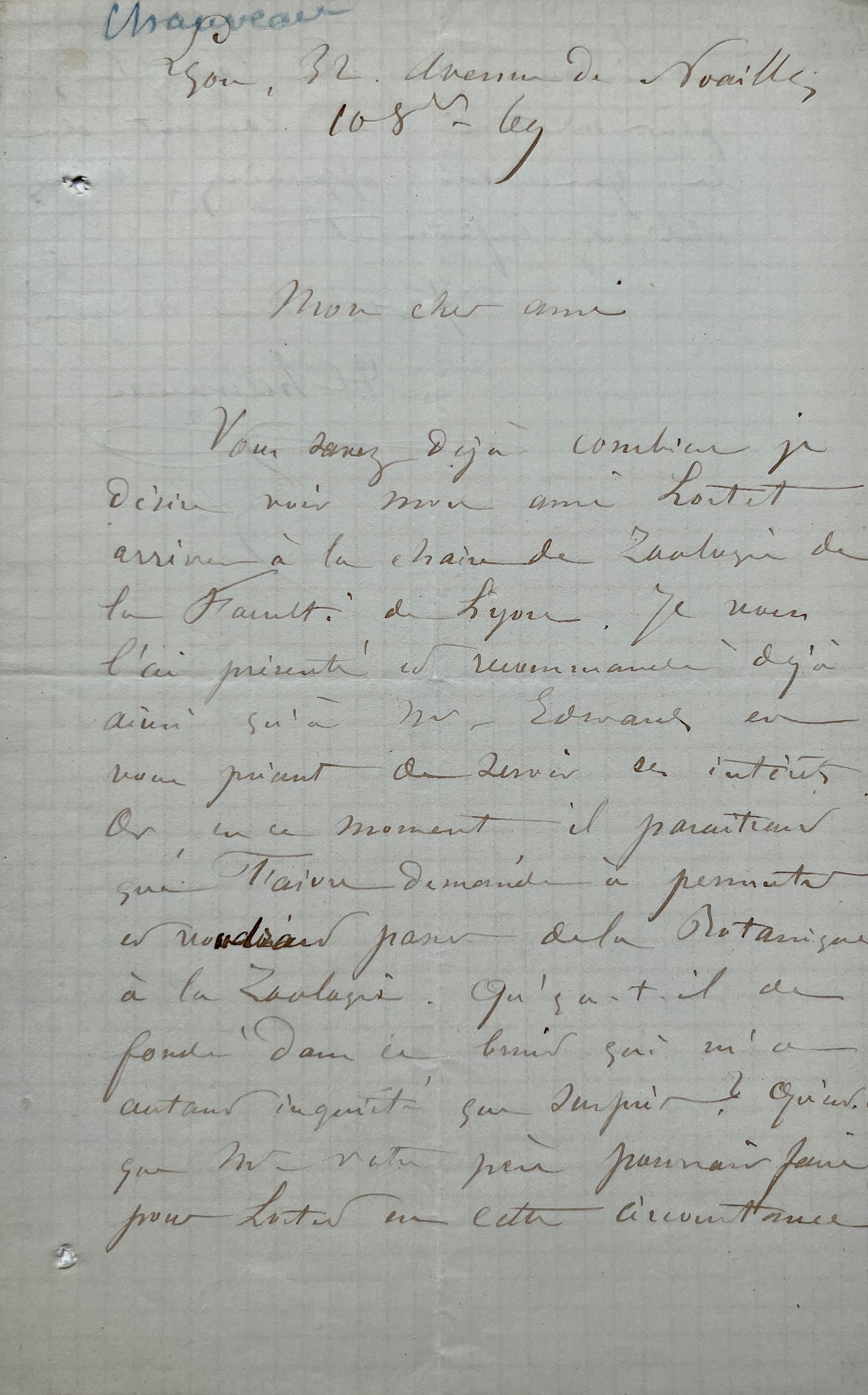 "Vous savez déjà combien je désire voir mon ami Lortet arriver à la chaire de Zoologie de la Faculté de Lyon. Je vous l'ai présenté et recommandé déjà ainsi qu'à Mr Edward [le zoologiste Alphonse Milne-Edwards ()] en vous priant de servir ses intérêts. Or, en ce moment il paraitrait que Faivre [Ernest Faivre (1827-1879), botaniste et directeur du Jardin botanique de Lyon] demande à permuter et voudrait passer de la Botanique à la Zoologie. Qu'y a-t-il de fondé dans ce bruit qui m'a autant inquiété que surpris ? Qu'est-ce que M. votre père pourrait faire pour Lortet en cette circonstance ?