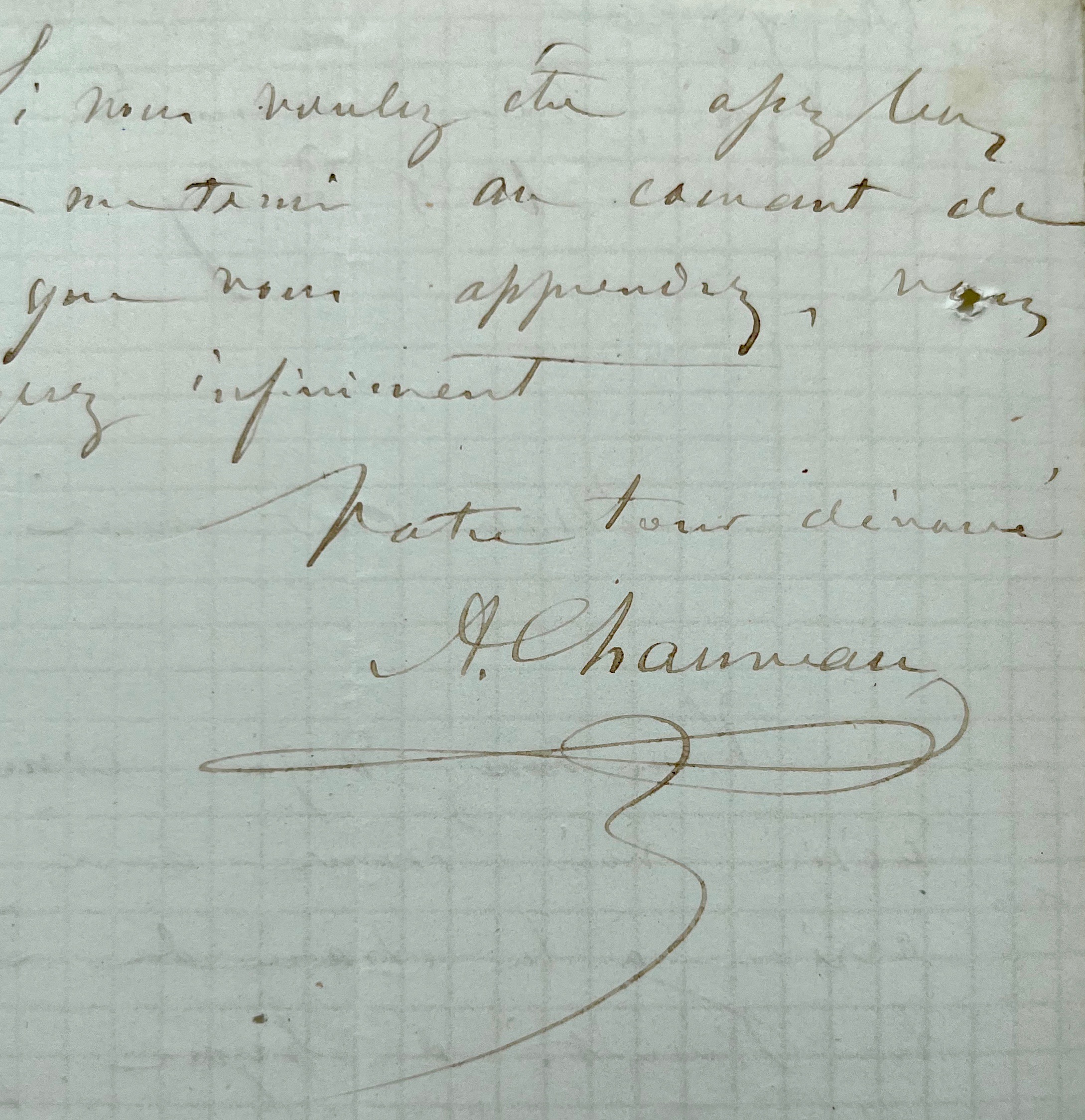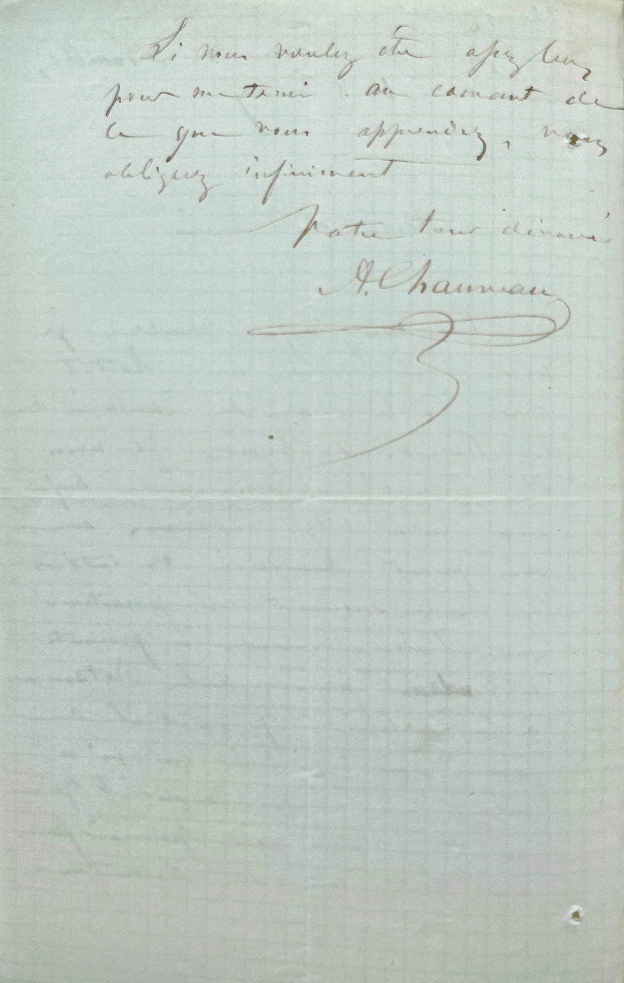 Auguste Chauveau (Villeneuve-le-Guyard, 1837/1917)Intéressant courrier de Chauveau relatif à ses volontés d'affectation pour son ami botaniste et zoologiste Louis Charles Émile Lortet :