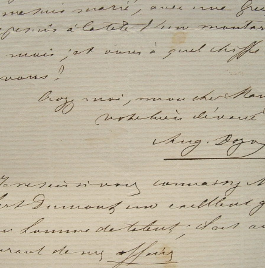 Auguste Dozon (Châlons-en-Champagne, 1822/1891)Alfred Dozon, en poste dans les Balkans depuis plusieurs années, se rappelle au souvenir d'Alfred Maury. «Vous vous rappellerez peut-être ma passion, tant soit peu malheureuse, pour les langues sauvages. Après le bulgare, elle m'a jeté dans l'albanais, et je termine un ouvrage sur cette dernière langue». Il lui en expose les grandes lignes : «1. un recueil de contes et chansons que je me suis fait dicter ; j'ai dû naturellement composer un alphabet. 2. des éléments de grammaire. 3. un vocabulaire comprenant les mots des deux premières parties, plus ceux d'un petit vocabulaire français-albanais, bref la meilleure partie des mots les plus usuels. Connaissant passablement le slave et le turc, j'ai pu donner les étymologies, sans parler des grecques et des latines [...]». Il souhaite désormais éditer ce travail qui lui a pris beaucoup de temps. Aussi, demande-t-il l'intervention d'Alfred Maury. [Son "Manuel de la langue Chkipe ou Albanaise, grammaire, chrestomathie, vocabulaire", ne paraîtra qu'en 1878].