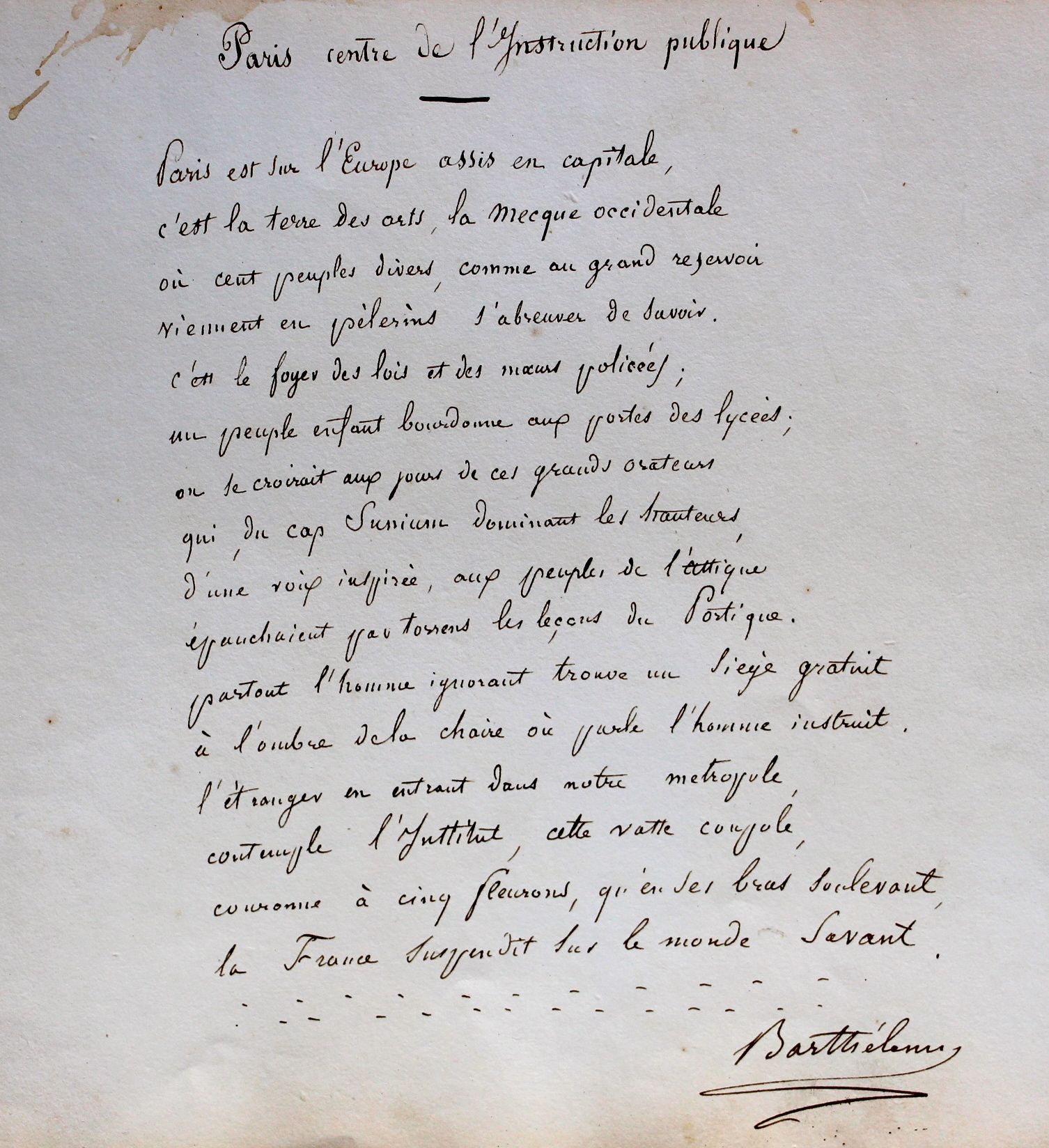Poème d'Auguste Marseille Barthélemy intitulé : "Paris centre de l'Instruction publique", en 16 alexandrins. "Paris est sur l'Europe assis en capitale / C'est la terre des arts, la Mecque occidentale / Où cent peuples divers, comme au grand réservoir / Viennent en pèlerins s'abreuver de savoir [...]".