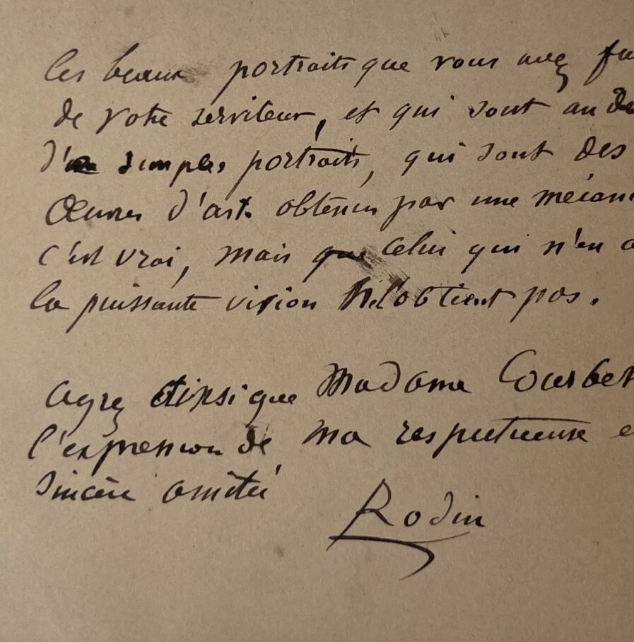 "Mon cher ami. J'ai reçu la lettre de faire part de la mort de Madame Ve Aug. Courbet. Je vous envoie mes condoléances. J'ai été bien heureux de penser à vous ces jours-ci, et je me félicite d'être un de vos amis, je n'oublie pas que je vous dois de la reconnaissance pour les beaux portraits que vous avez fait de votre serviteur, et qui sont au dessus de simples portraits, qui sont des oeuvres d'art obtenues par une mécanique c'est vrai, mais que celui qui n'en a pas la puissante vision ne l'obtient pas. Agréez ainsi que Madame Courbet l'expression de ma respectueuse et sincère amitié. Rodin".