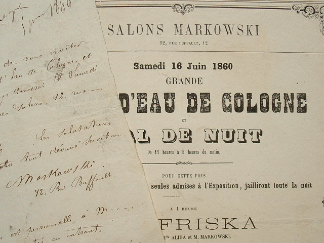 Petit dossier relatif au bal de nuit «de 11 heures à 5 heures du matin» organisé par le danseur et chorégraphe Markowski dans ses salons. 1. Affichette annonçant la "Grande fête d'eau de Cologne et bal de nuit" ponctuée de danses et entrecoupée de distribution d'eau de Cologne. 2. Lettre autographe signée Markowski, le modèle de l'invitation destinée à l'imprimeur. «J'ai l'honneur de vous inviter à la grande fête d'Eau de Cologne et Bal de Nuit que je donnerai le samedi 17 juin 1860 dans mes salons, 12 rue Buffault [...]» ; avec mention du tirage et du papier.