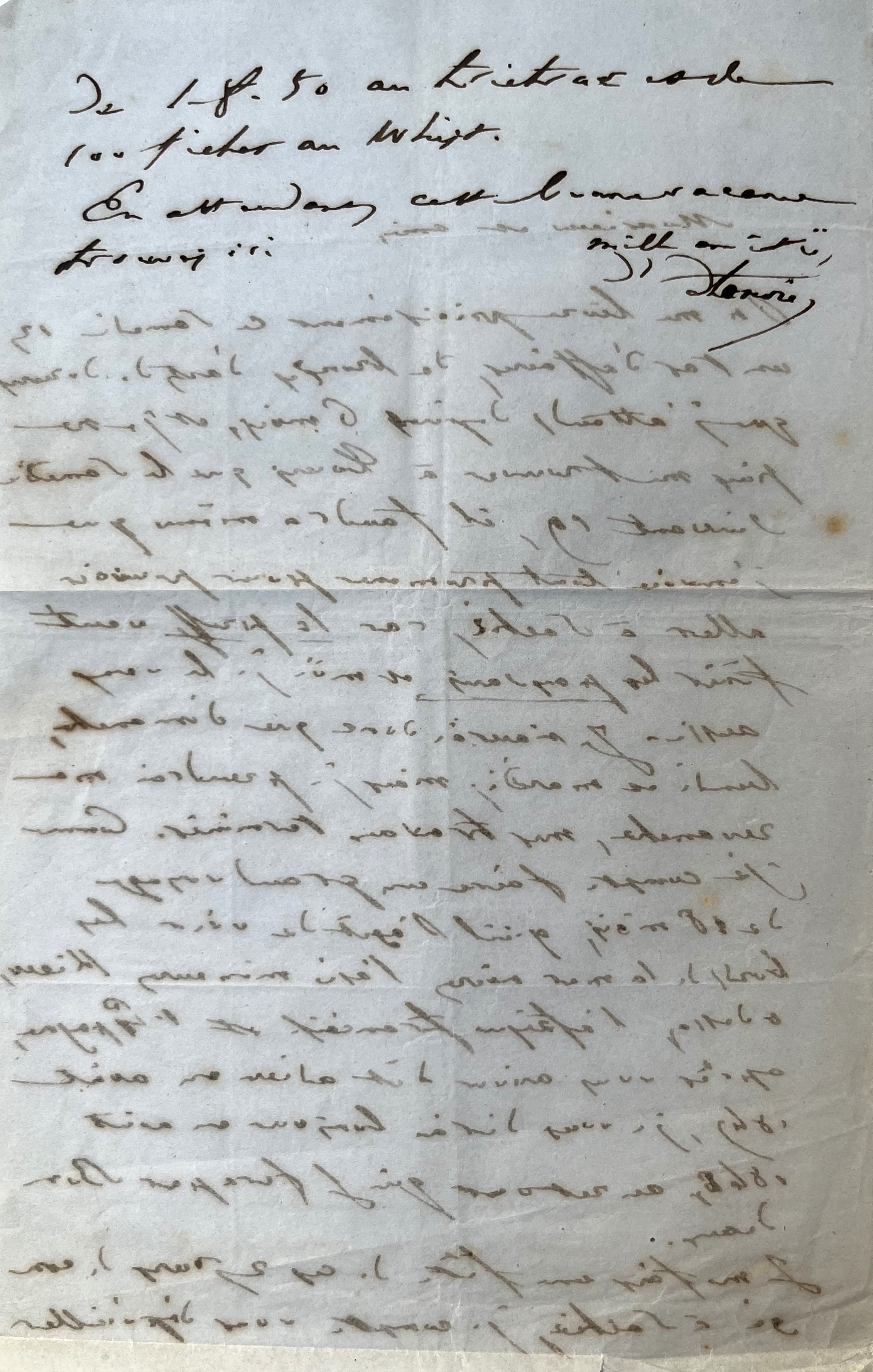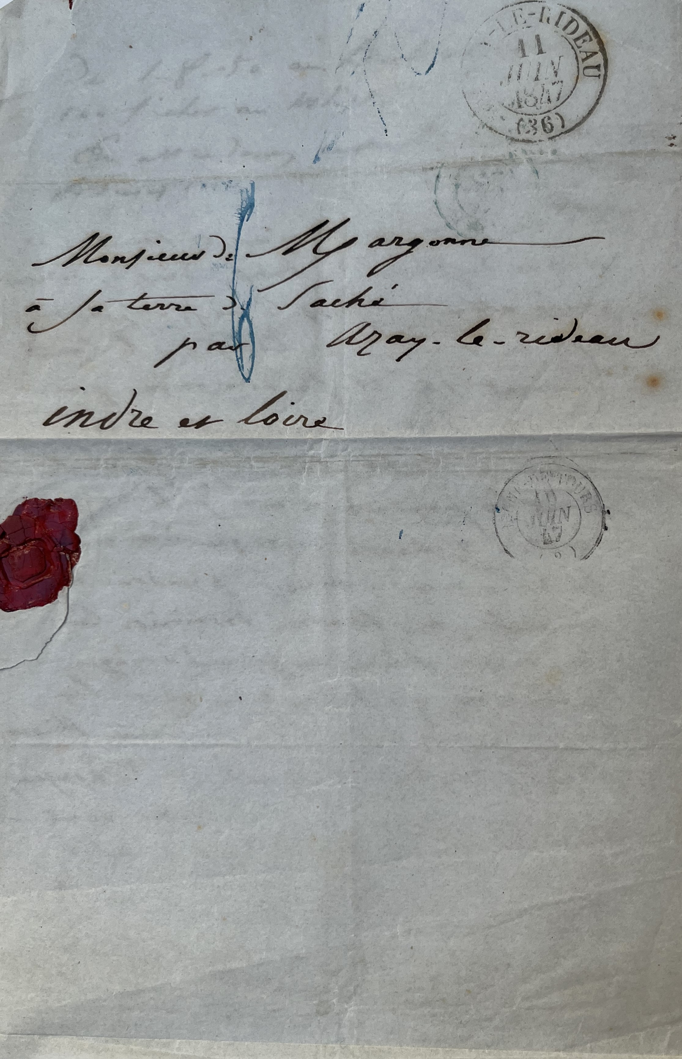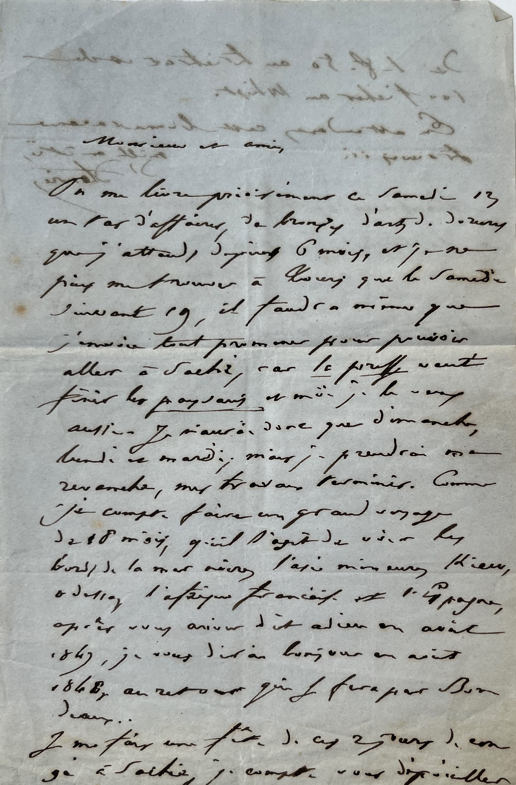 "Monsieur et ami. On me livre précisément ce samedi 12, un tas d'affaires, de bronzes d'arts, de dorures que j'attends depuis 6 mois, et je ne puis me trouver à Tours que le samedi suivant 19, il faudra même que j'envoie tout promener pour pouvoir aller à Saché car la Presse veut finir les Paysans et moi je le veux aussi. Je n'aurai donc que le dimanche, lundi et mardi ; mais je prendrai ma revanche, mes travaux terminés. Comme je compte faire un grand voyage de 18 mois, qu'il s'agit de voir les bords de la mer noire, l'Asie mineure, Kiew, Odessa, l'Afrique française et l'Espagne ; après vous avoir dit adieu en août 1847 je vous dirai bonjour en août 1848, au retour qui se fera par Bordeaux. Je me fais une fête de ces retours de congé à Saché, je compte vous dépouiller de 1 f 50 au trictrac et de 100 fiches au Whist. En attendant cette bonne vacance trouvez ici mille amitiés, Honoré".