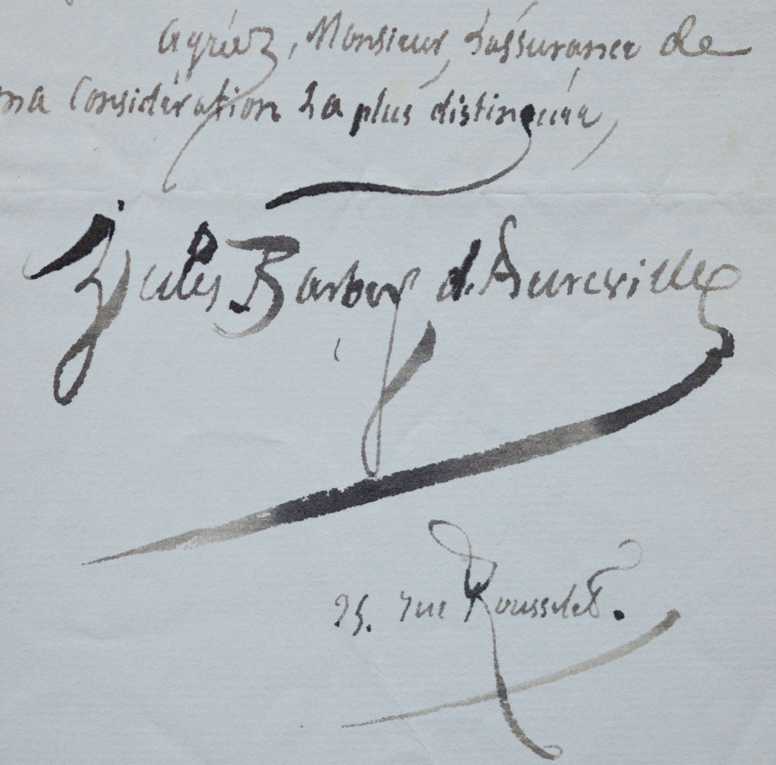 Jules Barbey d'Aurevilly (Saint-Sauveur-le-Vicomte, 1808/1889)Belle lettre de Jules Barbey d'Aurevilly, dans laquelle il est question de ses futurs écrits et de son roman Ce qui ne meurt pas. Quelques ratures et une correction.