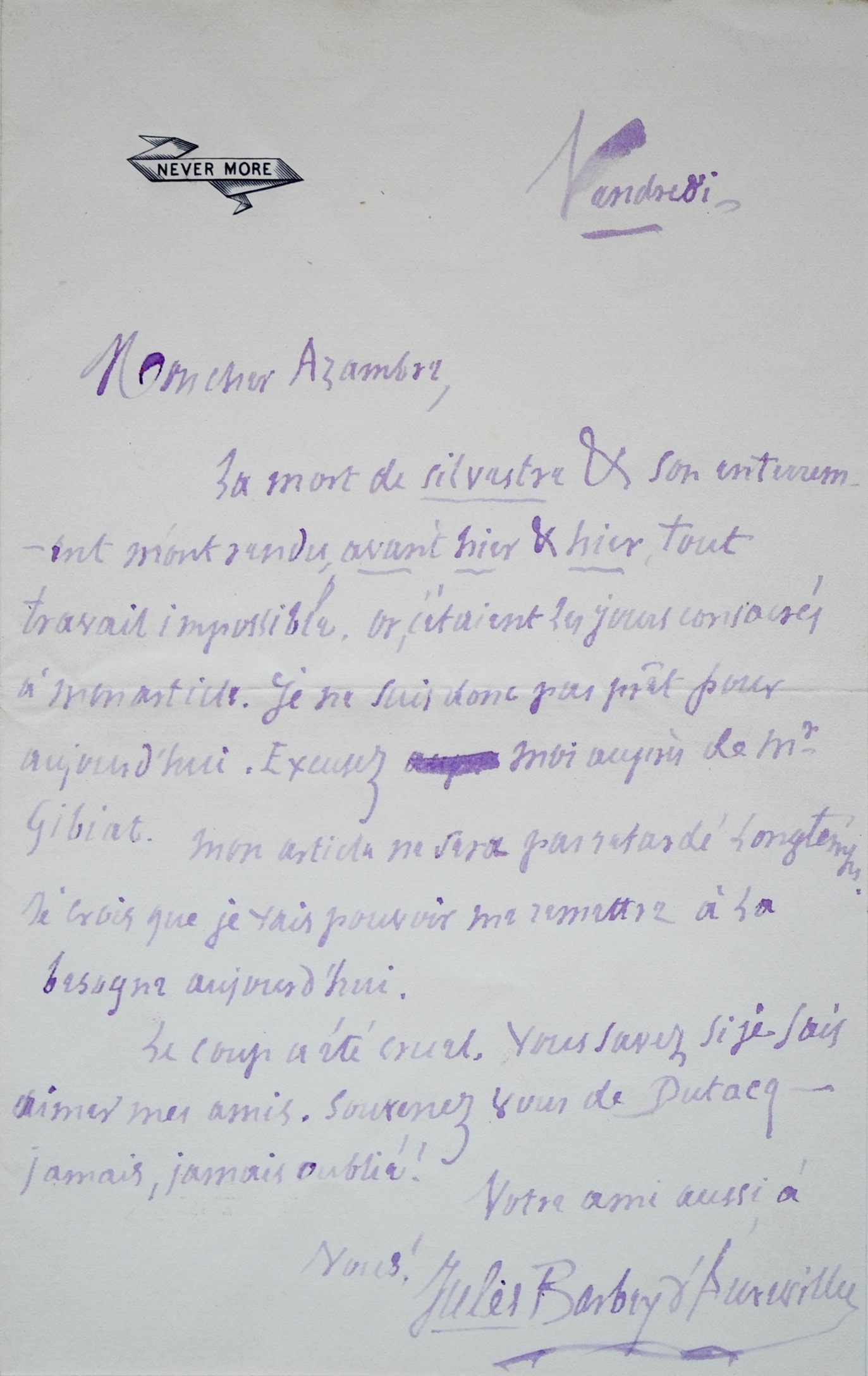 « [...] La mort de Silvestre & son enterrement m’ont rendu avant-hier & hier tout travail impossible. Or, c’étaient les jours consacrés à mon article. Je ne suis donc pas prêt pour aujourd’hui. Excusez moi auprès de Mr Gibiat. Mon article ne sera pas retardé longtemps. Je crois que je vais pouvoir me remettre à la besogne aujourd'hui. Le coup a été cruel. Vous savez si je sais aimer mes amis. Souvenez-vous de Dutacq [beau-frère d’Azambre] – jamais, jamais oublié ! [...]».