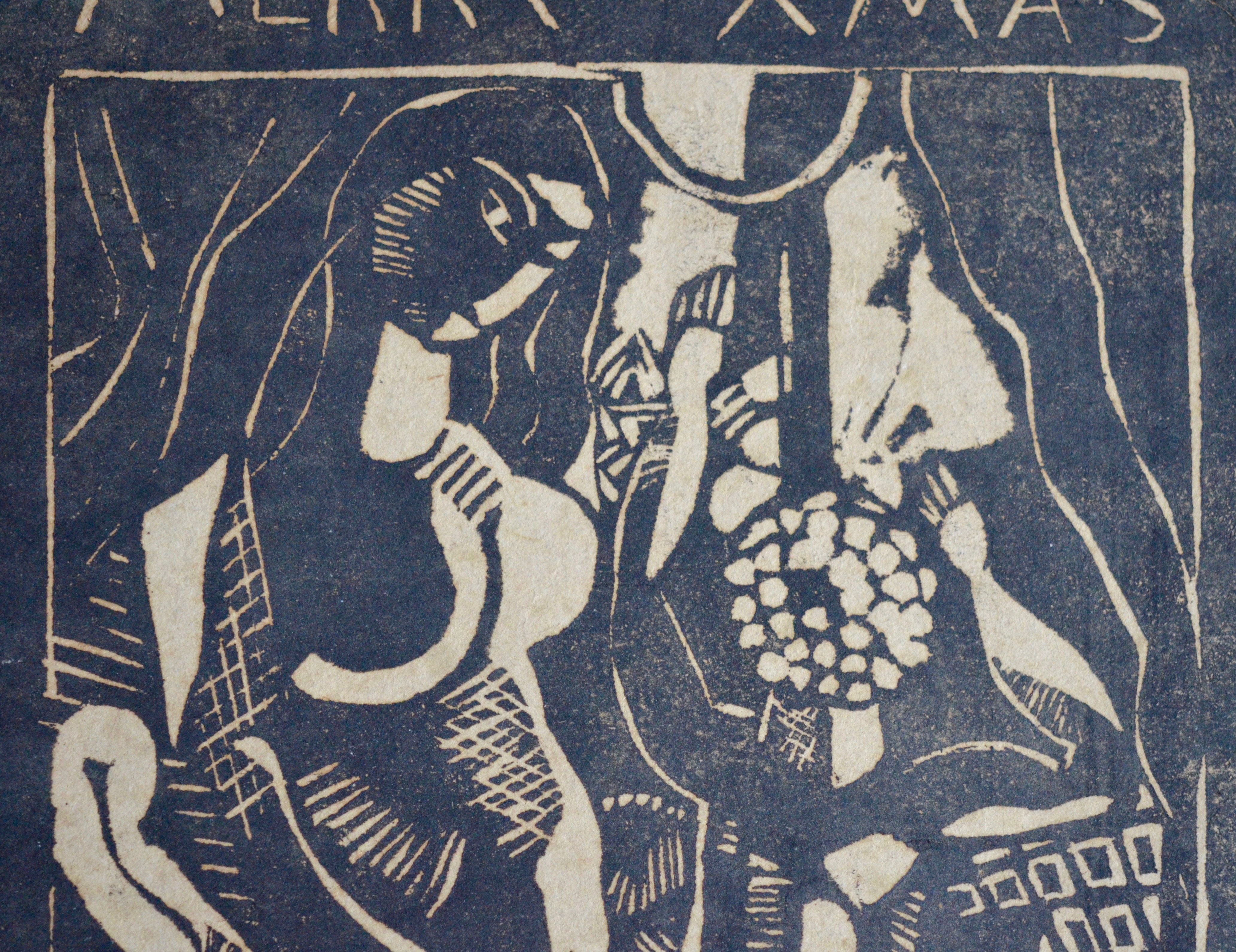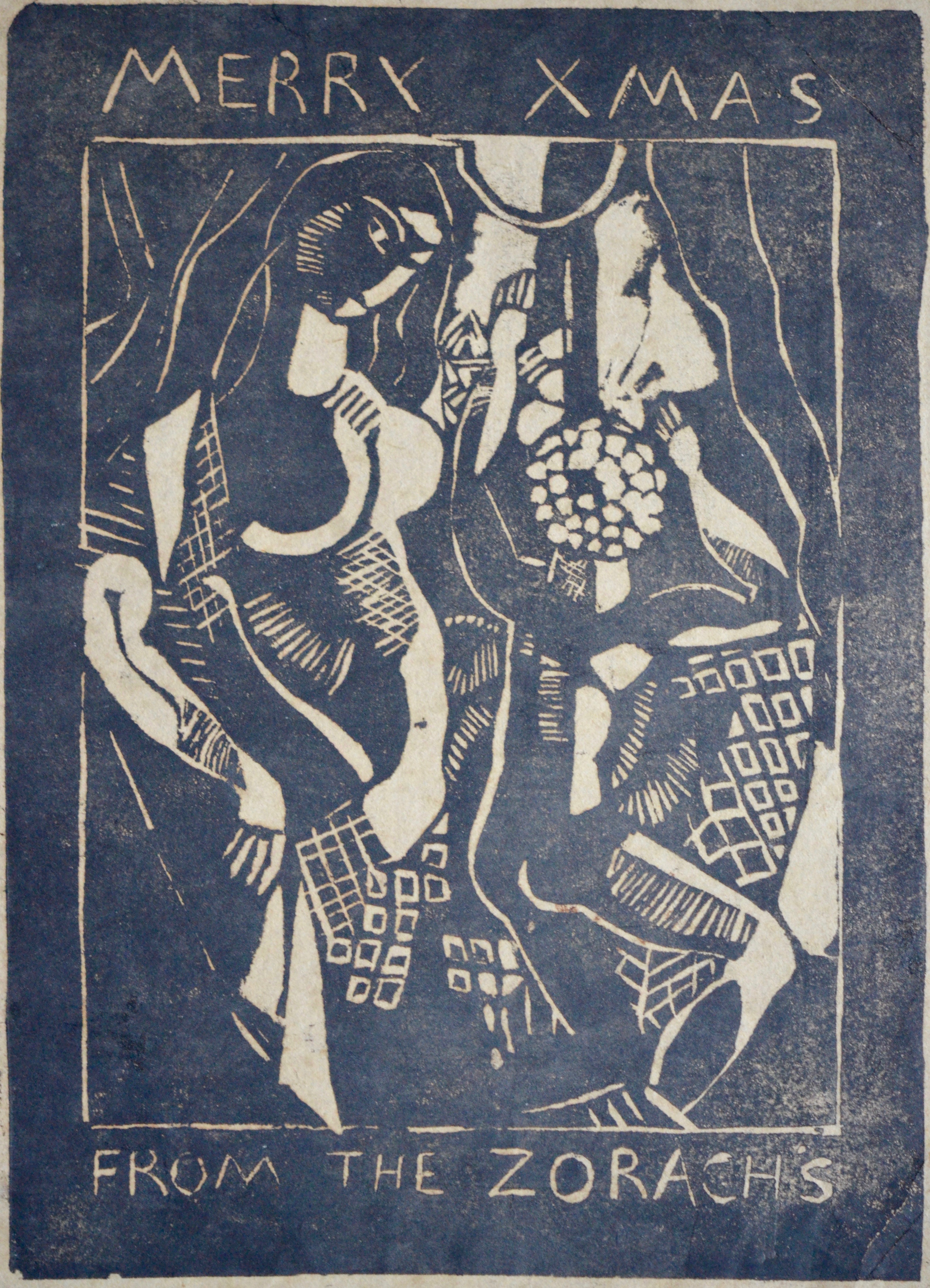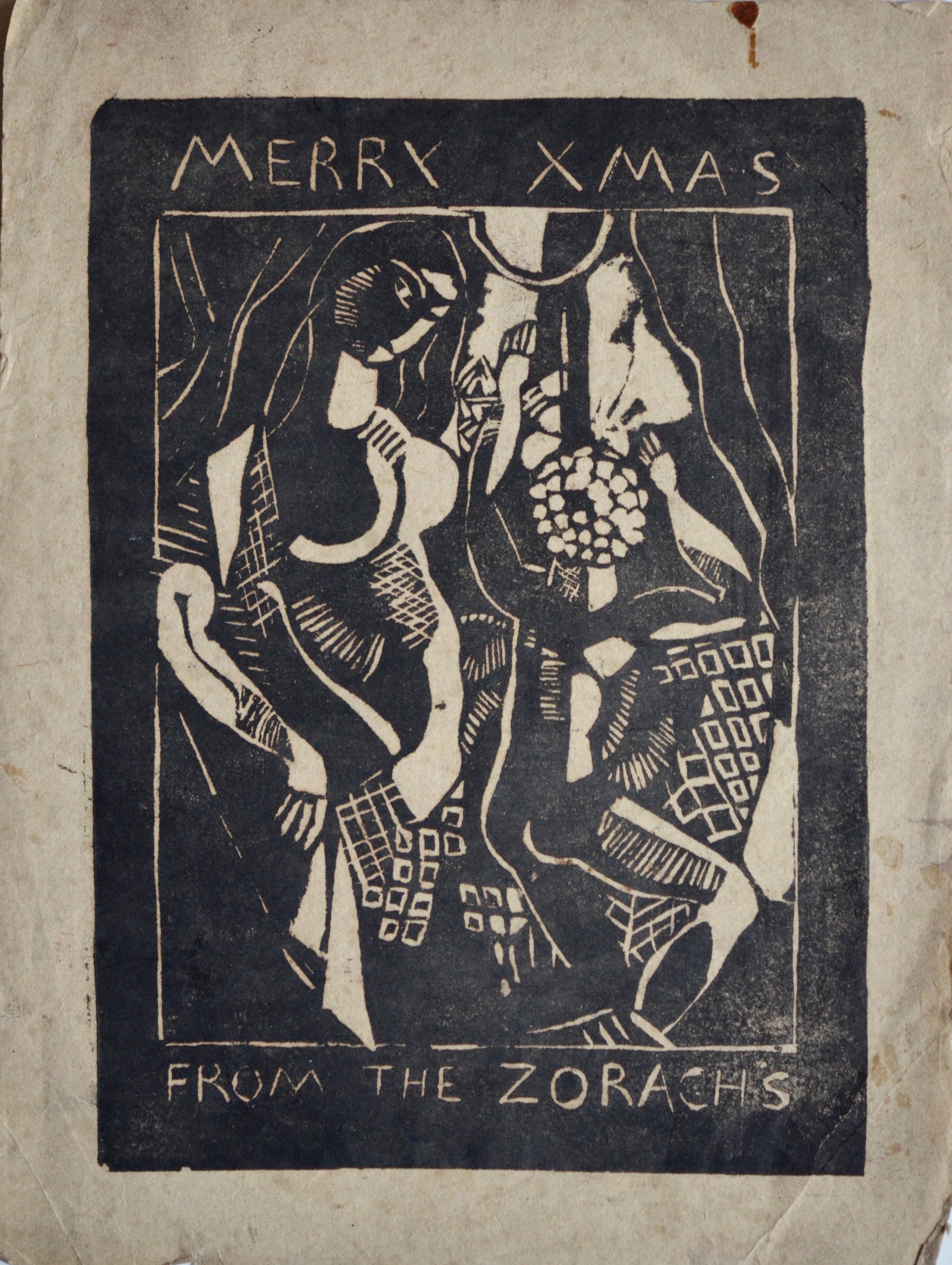 Beau bois gravé cubiste. Il représente une Vierge à l'Enfant, très caractéristique du travail de Marguerite Zorach. L'illustration porte les voeux : "Merry Xmas from the Zorach's" en-tête et en pied.