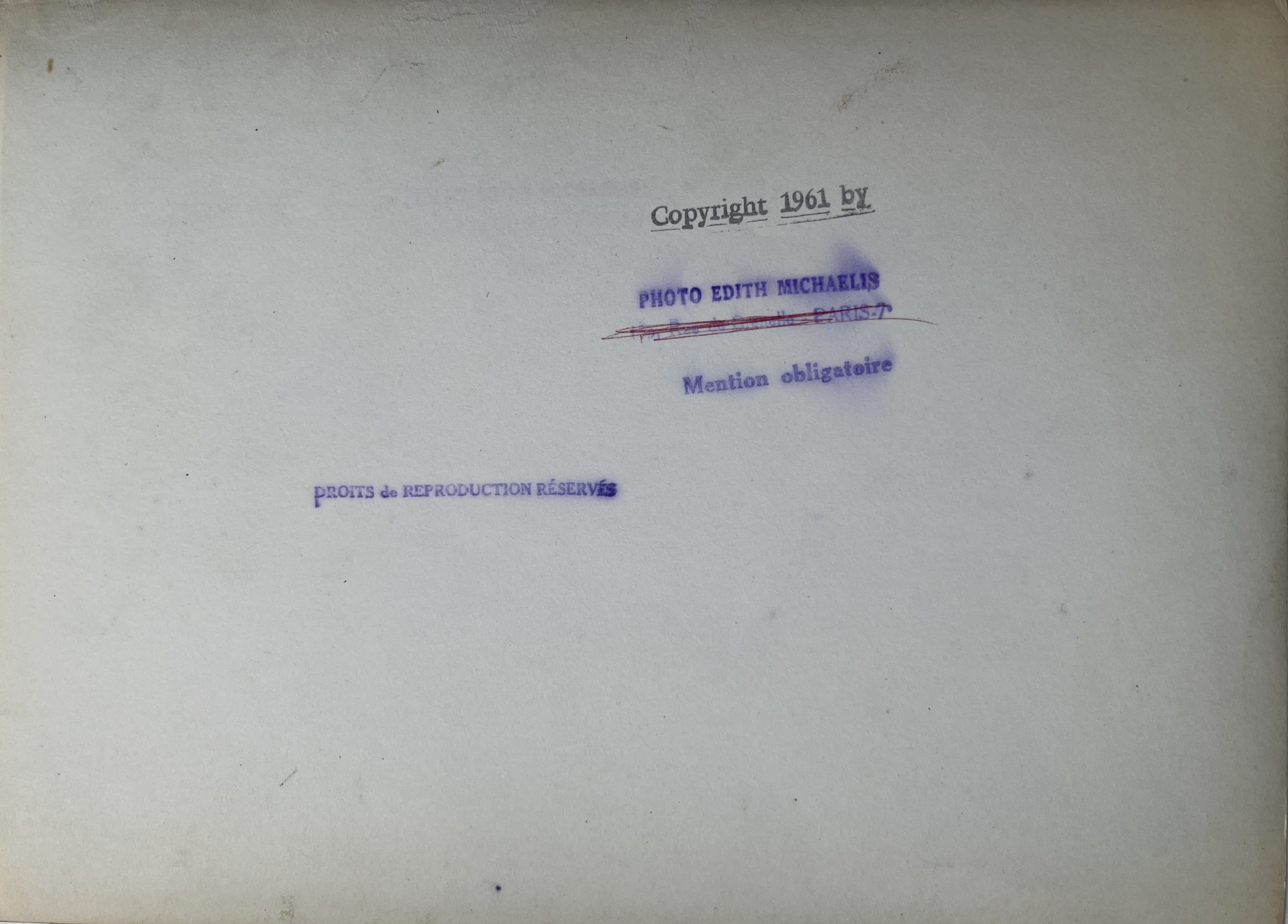 Au dos trois cachets "Photo Edith Michaelis - rue de Grenelle Paris 7e - mention obligatoire", "Copyright 1961" et "Droits de reproduction réservés".