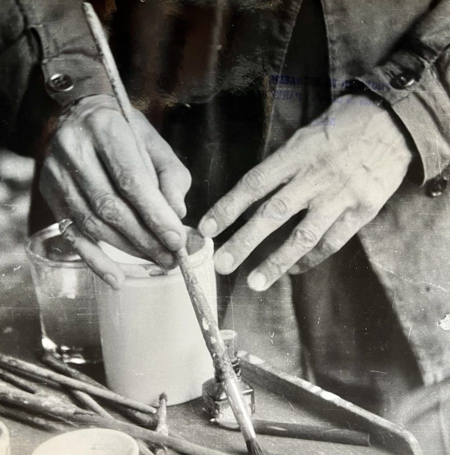 Beau cliché des mains de Georges Braque avec ses pinceaux, dans son atelier