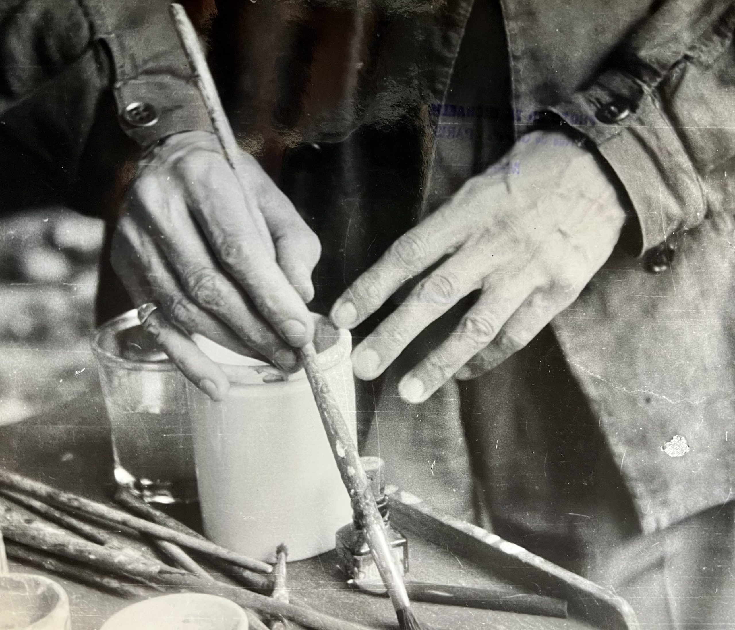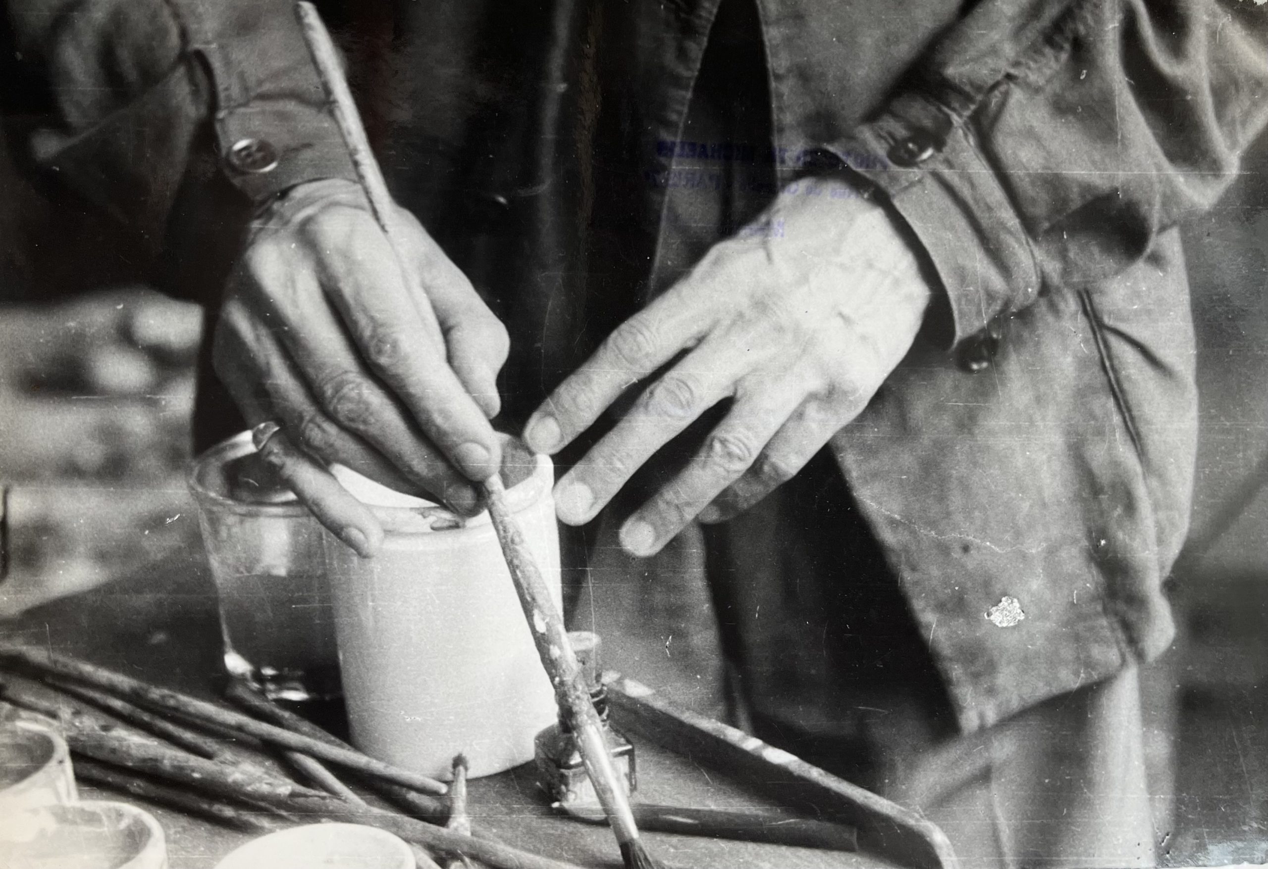 Belle photographie d'Edith Michaelis figurant les mains de Georges Braque, au travail dans son atelier, tenant un pinceau.