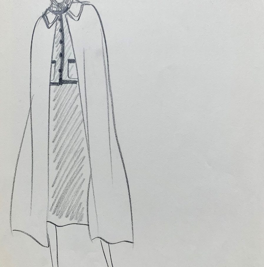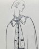 Elle porte un tailleur jupe longue veste droite, recouvert d’une longue cape à col plat. La tenue est achevée par un foulard noué au cou et des souliers pointus.