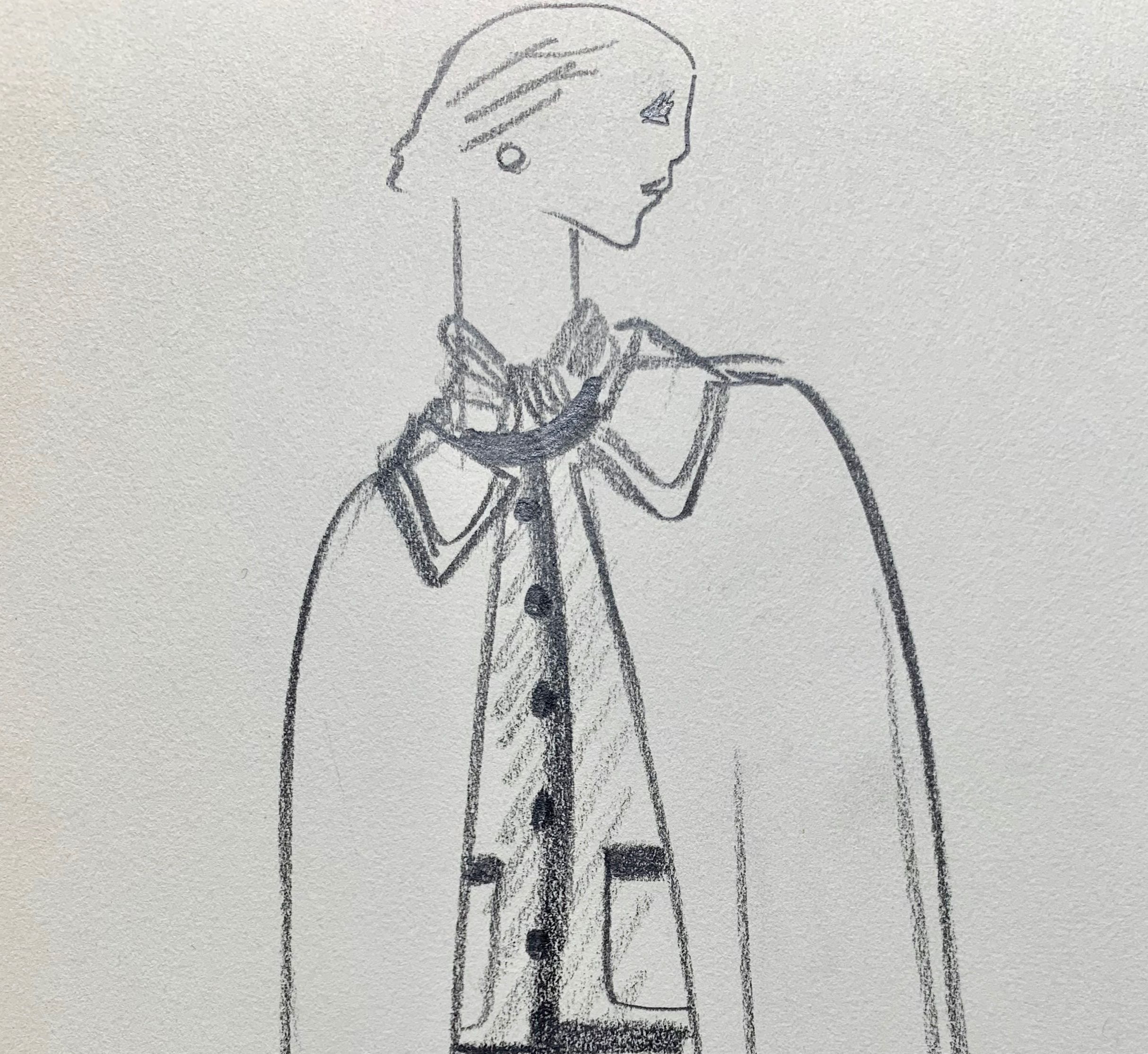 Très beau dessin, représentant un mannequin élégamment vêtu, en pied et de face, chignon et boucles d’oreilles, bras le long du corps et visage de profil.