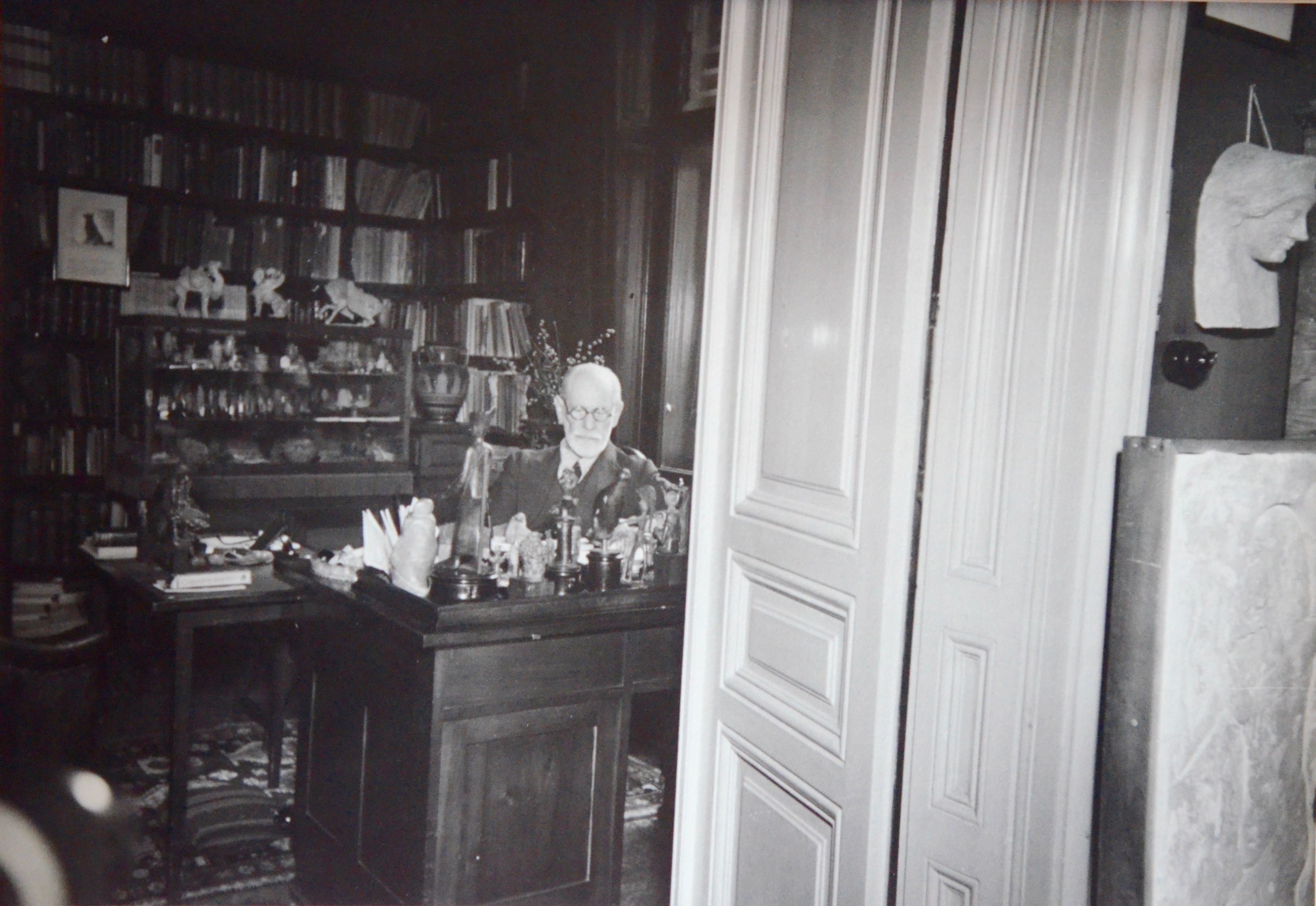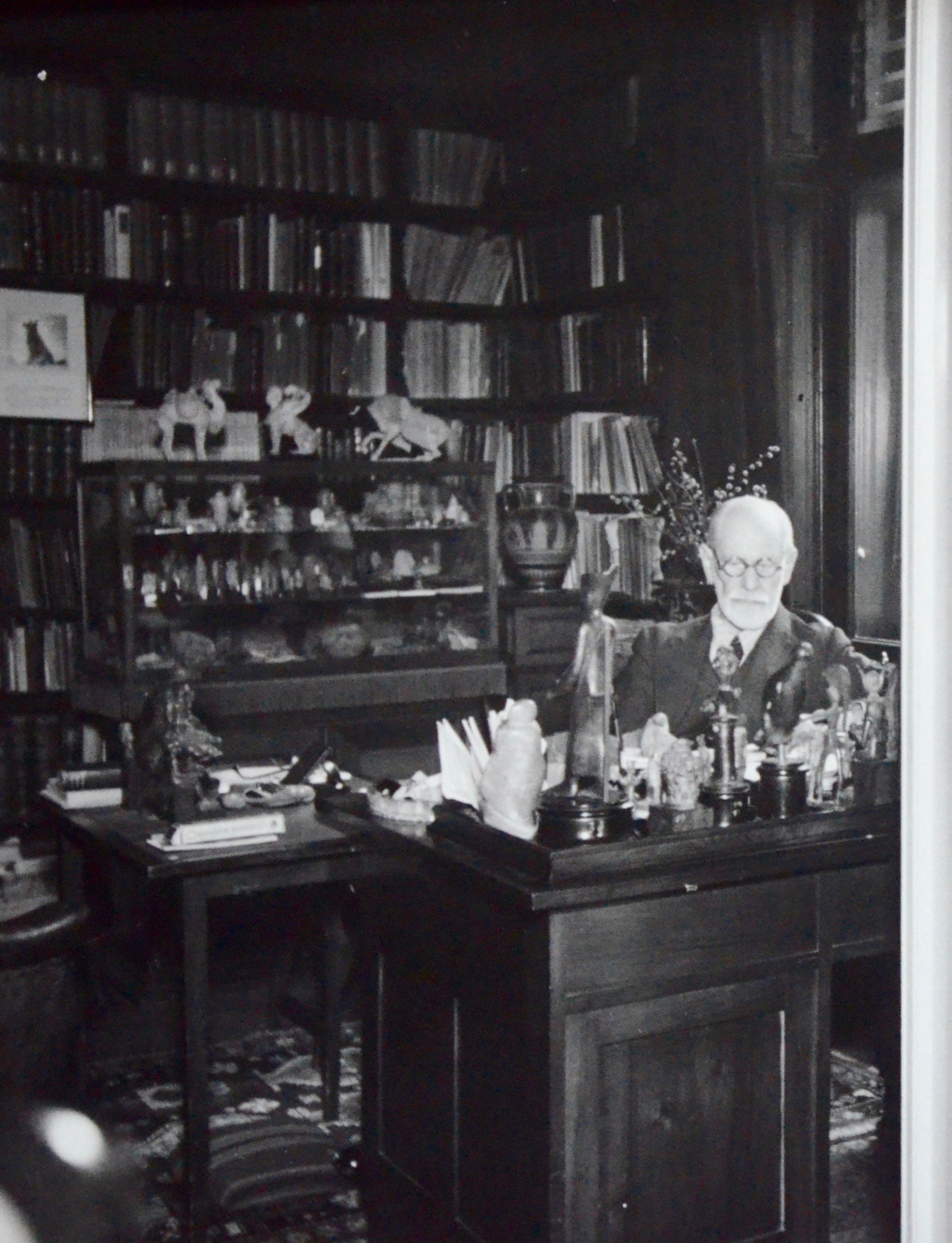 Très belle photographie où l'on peut apercevoir l'éminent psychanalyste au milieu de ses livres et de ses innombrables objets d'art, principalement datant de l'antiquité et notamment en provenance d'Egypte et de Grèce.