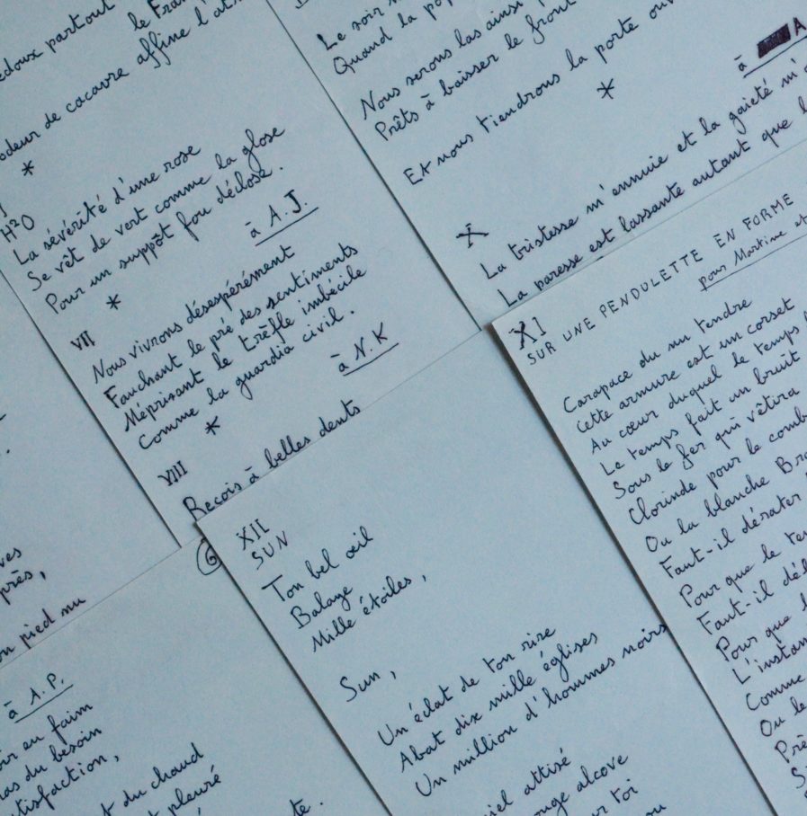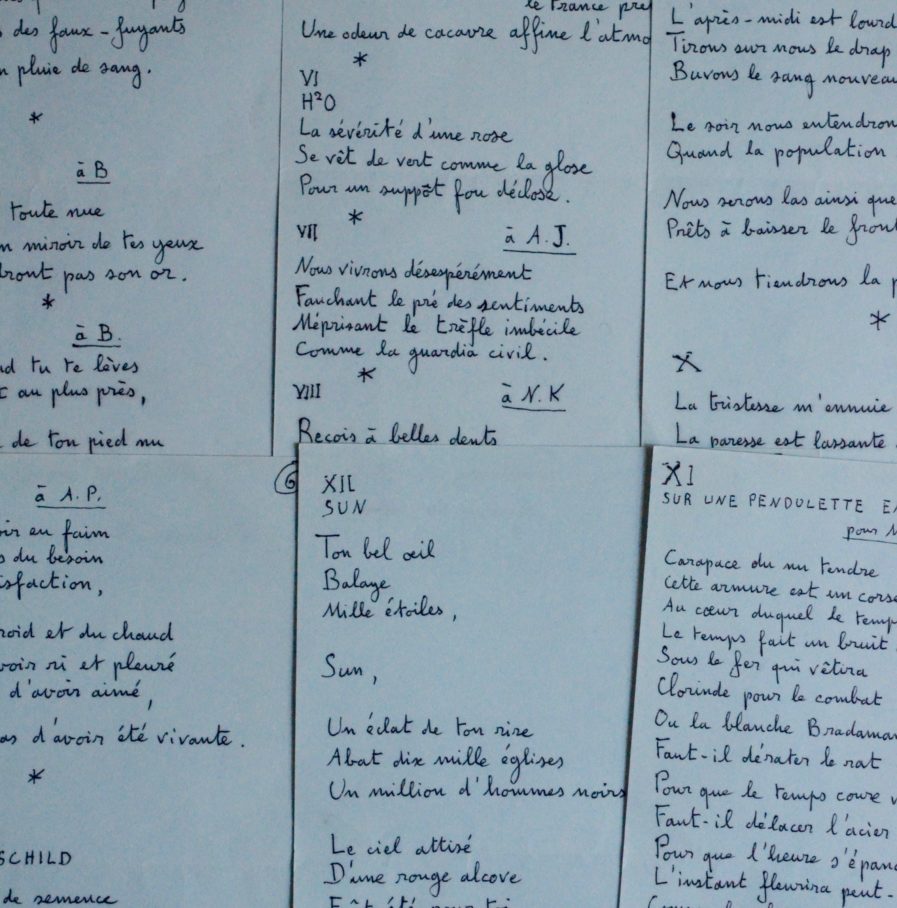 André Pieyre de Mandiargues (Paris, 1909/1991)Manuscrit mis au net d'André Pieyre de Mandiargues, intitulé "Rose des circonstances" et composé de quatorze poèmes surréalistes, numérotés de I à XIV. Certains ont des titres : deux sont adressés "à B" [Bona?, son épouse], un "à A.J.", deux "à N.K.", un "à A.S." et un "à A.P." ; d'autres portent un titre : " H2O", "Prestige", "Méridienne", "Sun", "Mouton Rothschild", "Panneau routier" ou "Sur une pendulette en forme de cuirasse", ce dernier fut dédié au peintre, photographe et écrivain Bernard Dufour et à sa femme Martine. Certains de ces poèmes furent publiés en 1964, chez Gallimard dans le recueil Le Point où j'en suis.