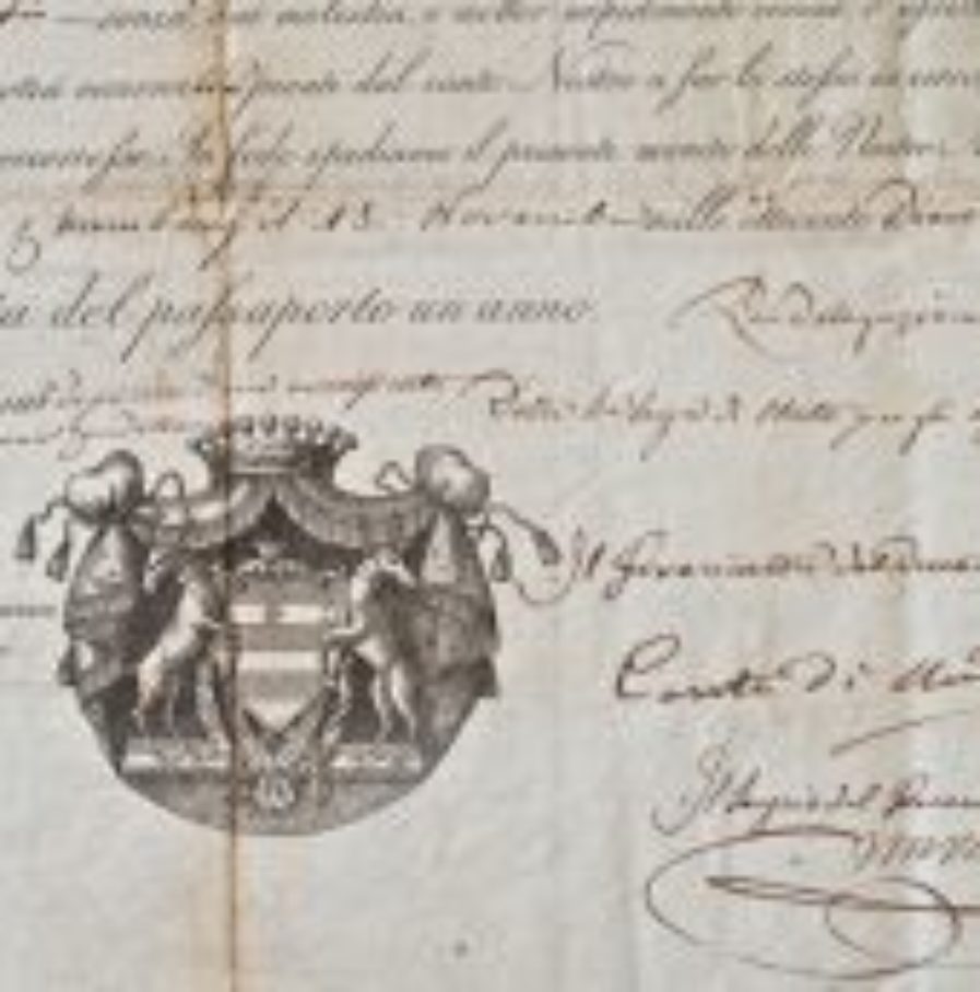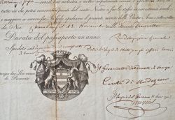 Passeport délivré au nom du roi de Sardaigne, pour Natale Rostaing, natif de Saint-Colomban-des-Villards (Savoie) se rendant à Voiron. Signatures et cachets. Il est orné de 2 superbes vignettes gravées.