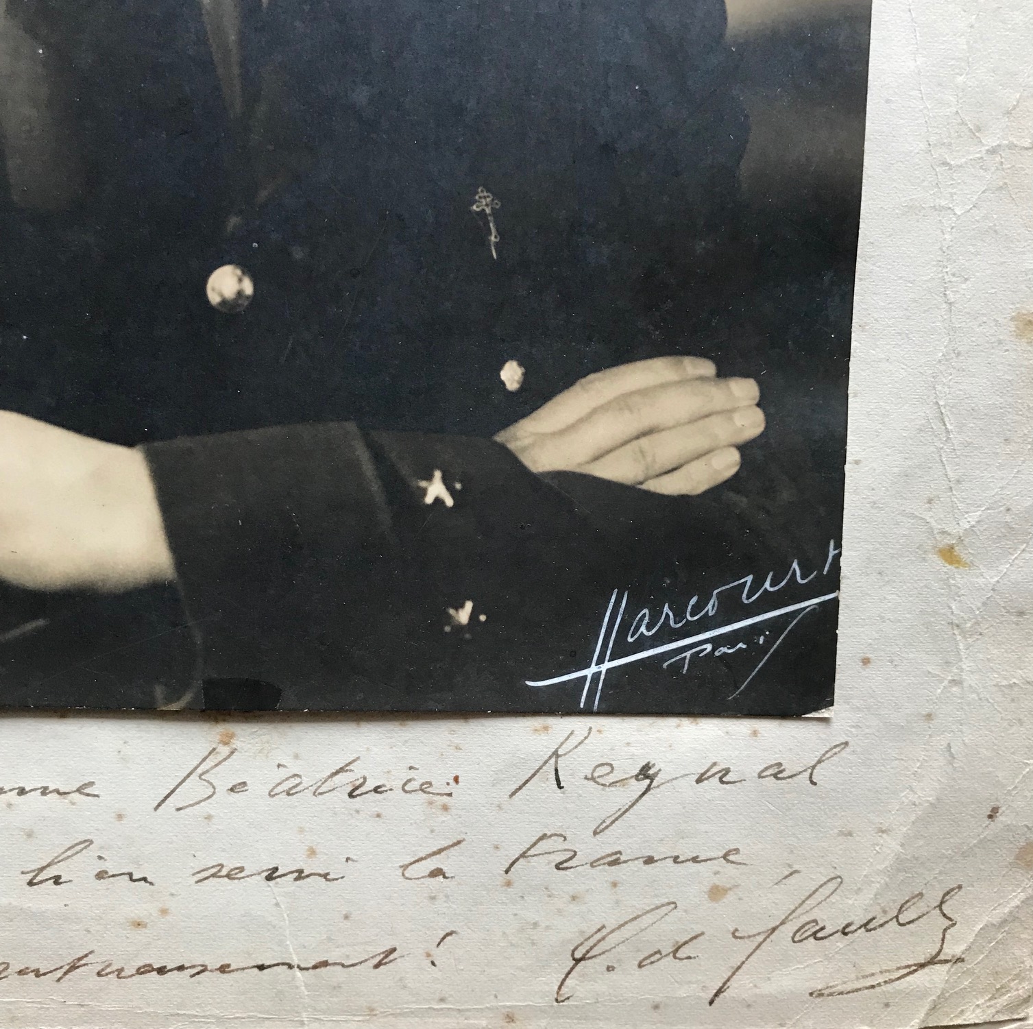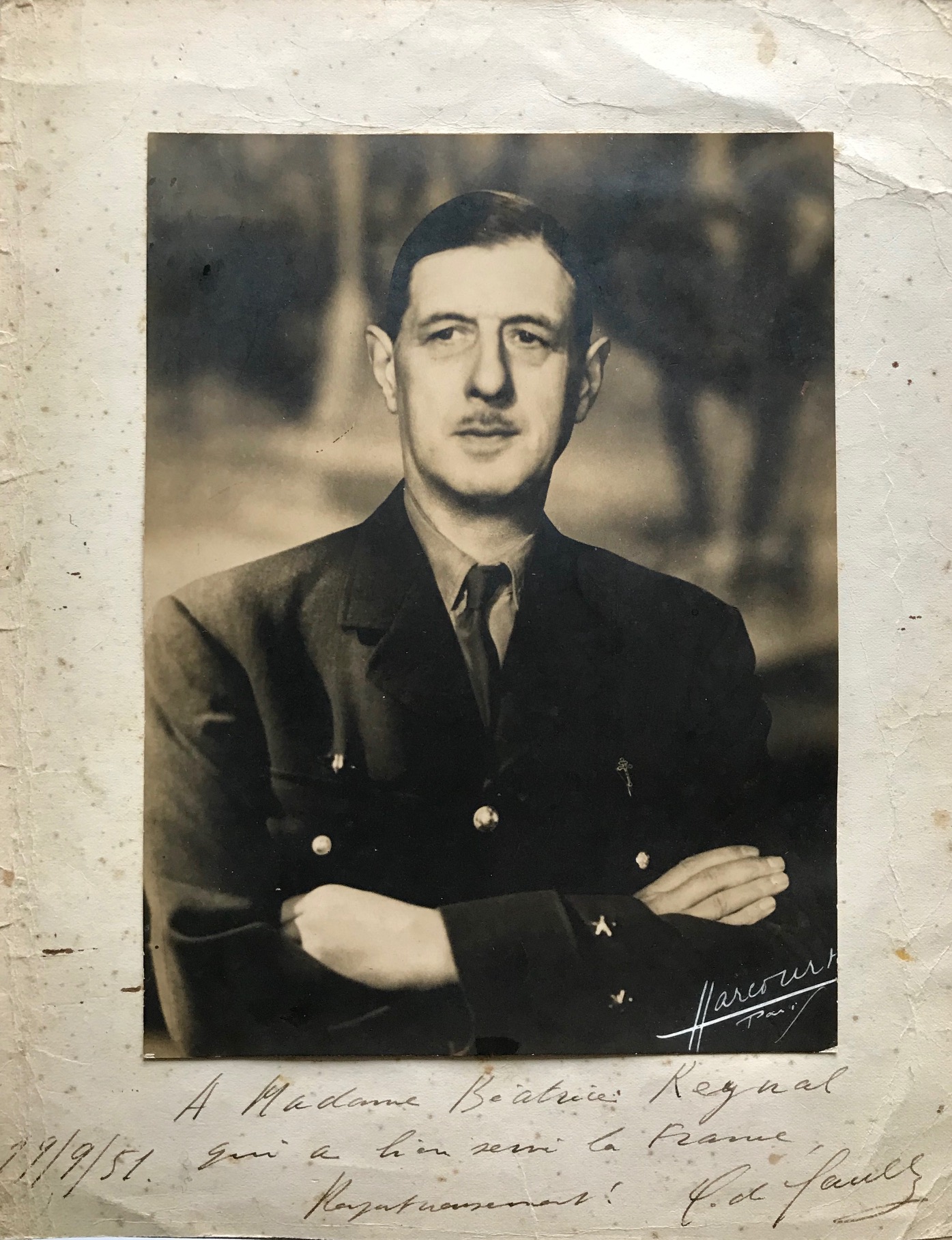 Bel envoi autographe signé et daté de Charles de Gaulle, sur la montage : "A Madame Béatrice Reynal qui a bien servi la France. 19/9/51. Respectueusement ! [...]".