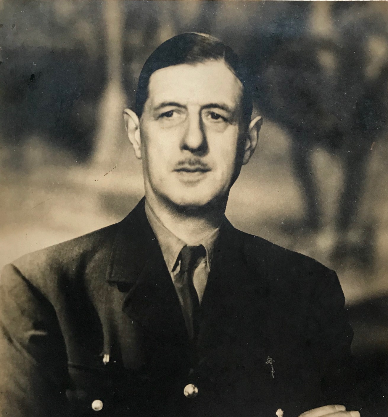 Célèbre portrait en buste du général De Gaulle, de face. Tirage argentique d'époque du studio Harcourt, à Paris (signature en blanc en pied du cliché), fixé sur papier fort (32 x 25,5 cm).