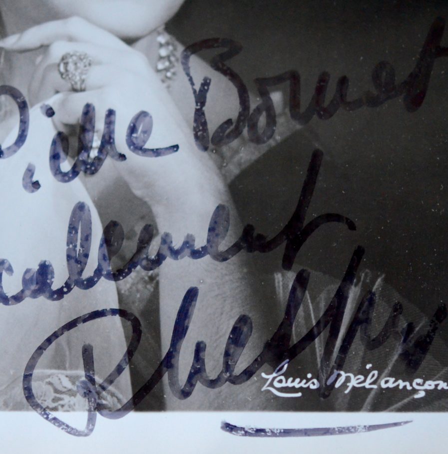 Beau portrait de Régine Crespin, en buste. Tirage noir et blanc. Signature "Louis Mélançon" dans le négatif.