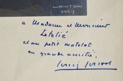 Portrait photographique (signé Lipnitzki) de Louis Jouvet, plongé dans la lecture d'un livre, une ombre portée sur le mur. Dédicace en marge : «A Madame et Monsieur Letelié et au petit matelot en grande amitié. Louis Jouvet.»