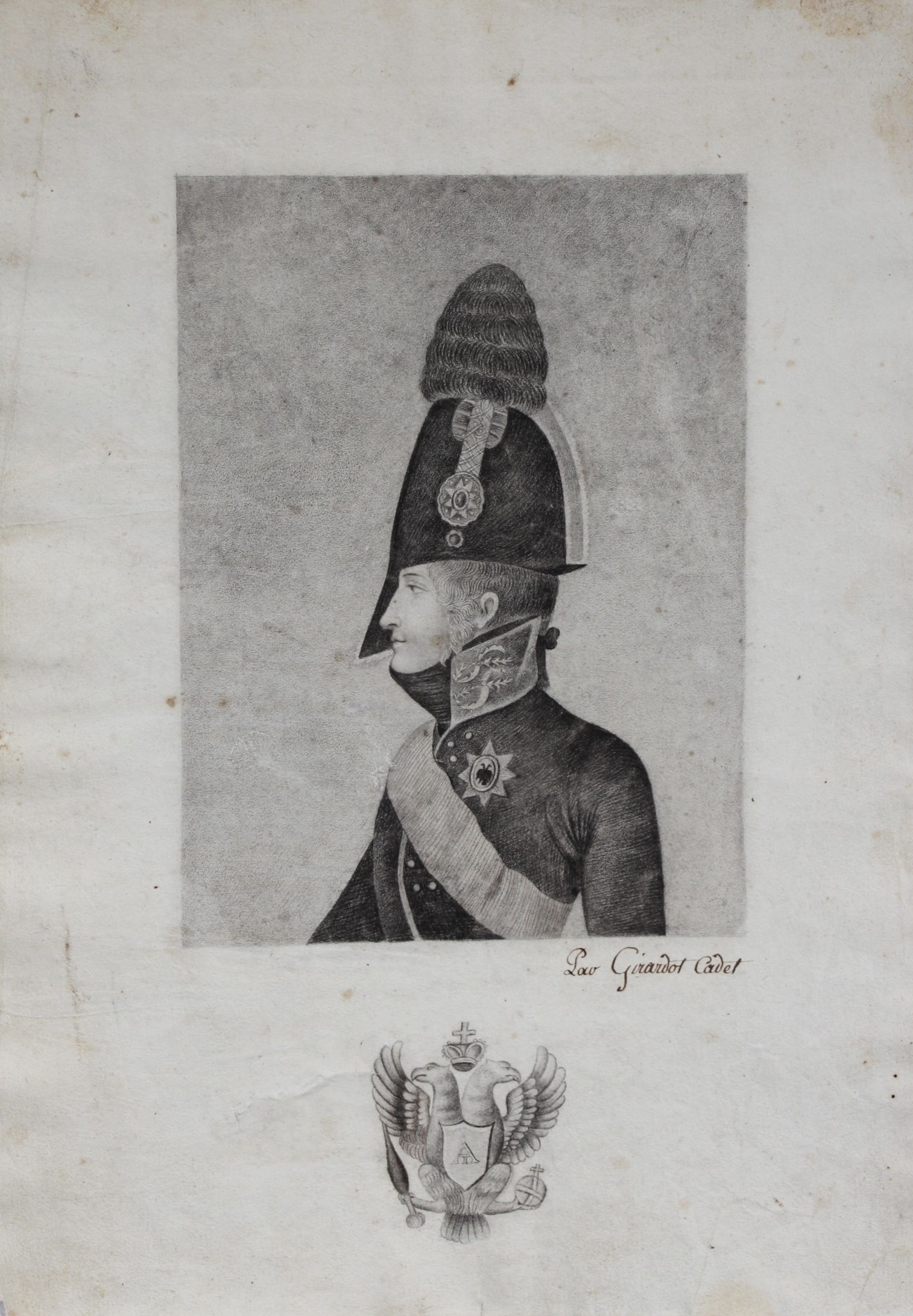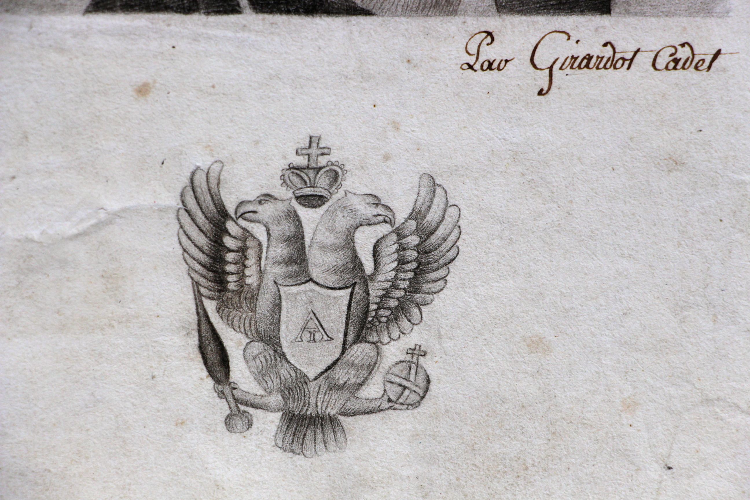 Dessin original, mine de plomb et estompe, signé à l'encre « Girardot cadet ». Beau et fin portrait d'époque du tsar Alexandre 1er avec ses armoiries dessinées en marge.