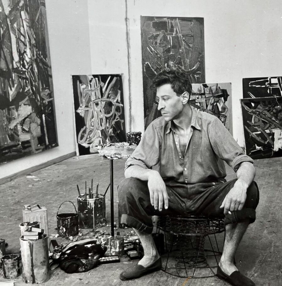 Belle photographie de Nicolas de Staël, assis, sombre et perdu, dans son atelier, entouré de ses peintures, par Edith Michaelis.