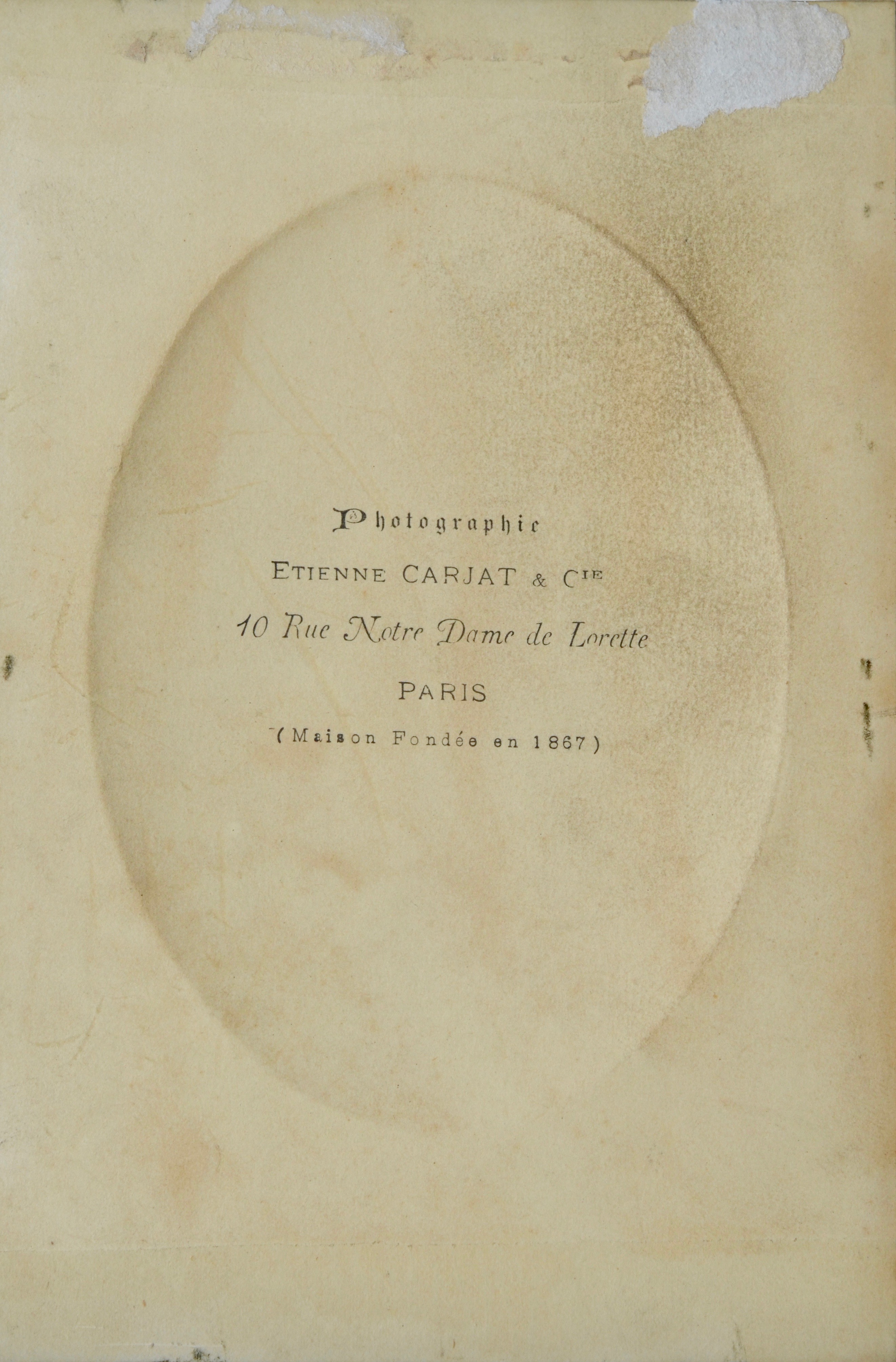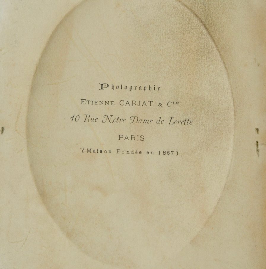 Beau portrait de Victor Hugo en médaillon par Carjat. Taille du portrait : 11,5 x 8,3 cm. Nom et adresse du photographe, imprimés au verso. Épreuve sur carton bombé, format cabinet (16,4 x 10,8 cm).