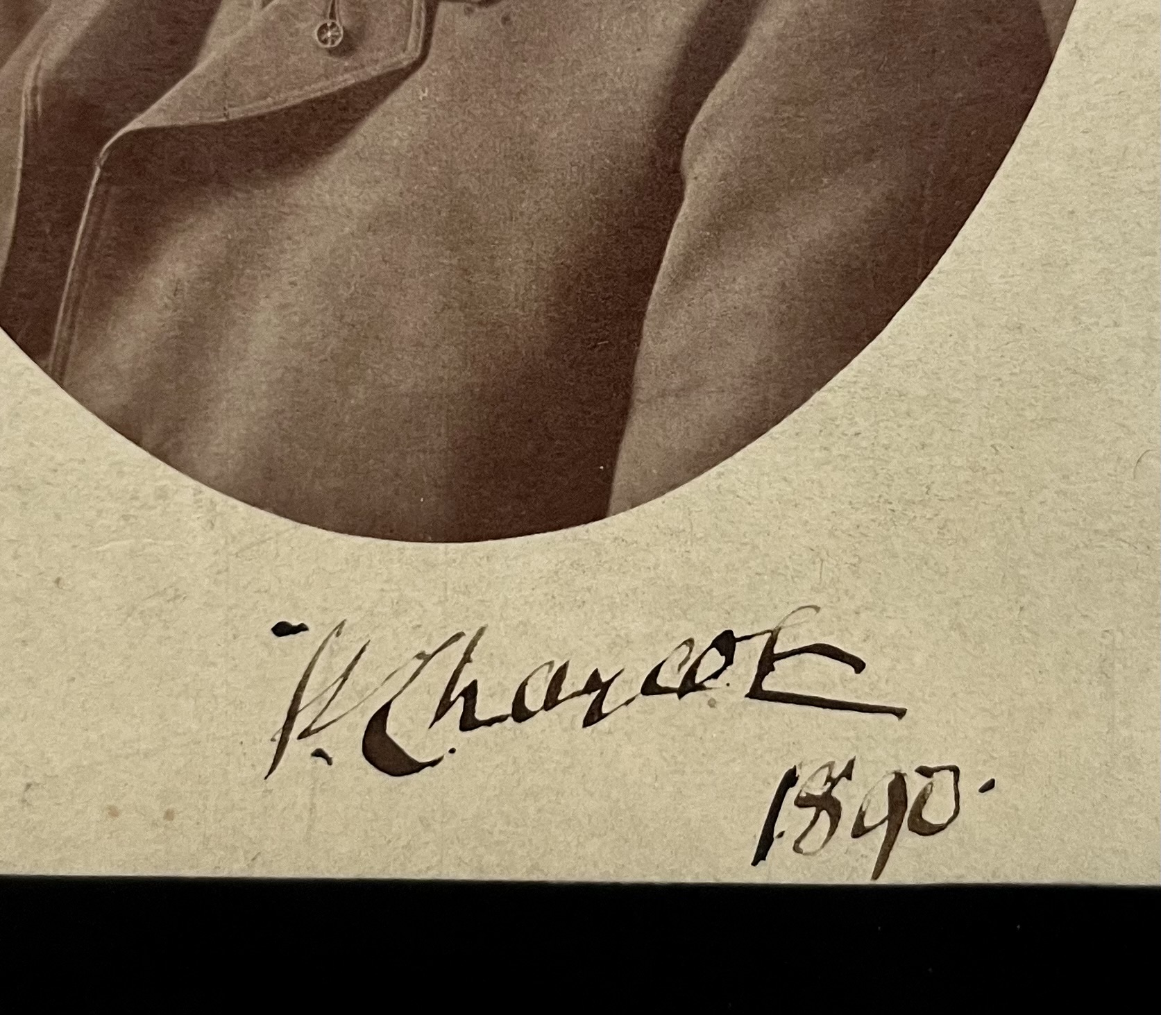 Portrait photographique de Jean-Martin Charcot, de profil. Tirage argentique, format cabinet, dans un médaillon ovale.