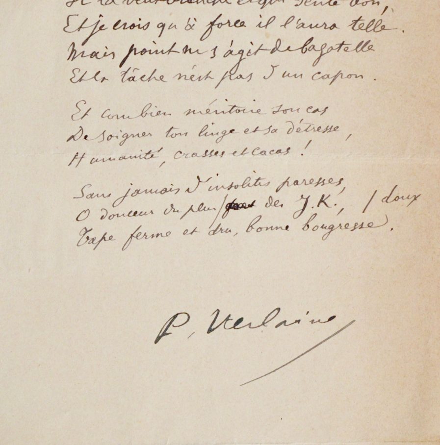 Paul Verlaine (Metz, 1844/1896)Beau sonnet autographe signé de Paul Verlaine, intitulé "J.K. Huÿsmans".