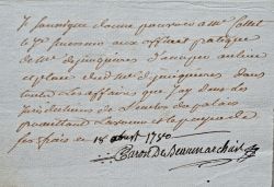 Pierre Augustin Beaumarchais (Caron de) (Paris, 1732/1799)Par ce document, Beaumarchais promet l'avancement et le paiement des frais de son nouvel avocat, Me Collet, remplaçant de Me de Jonquière, « dans toutes les affaires que j'ay dans les juridictions de l'enclos du palais ». L'« enclos du palais », siège majeur de la Justice, désigne les cours souveraines de la Conciergerie, la Sainte-Chapelle, etc. Me de Jonquière avait été le défenseur de Beaumarchais dans la longue affaire de l'héritage Paris Duverney, opposant le neveu du défunt et Beaumarchais lui-même, affaire qui donna lieu à un procès fleuve finalement gagné par l'écrivain en 1778. Plus largement, la vie de Beaumarchais fut jalonnée de scandales et de procès et la nécessité d'avoir à son service un avocat dévoué était grande.