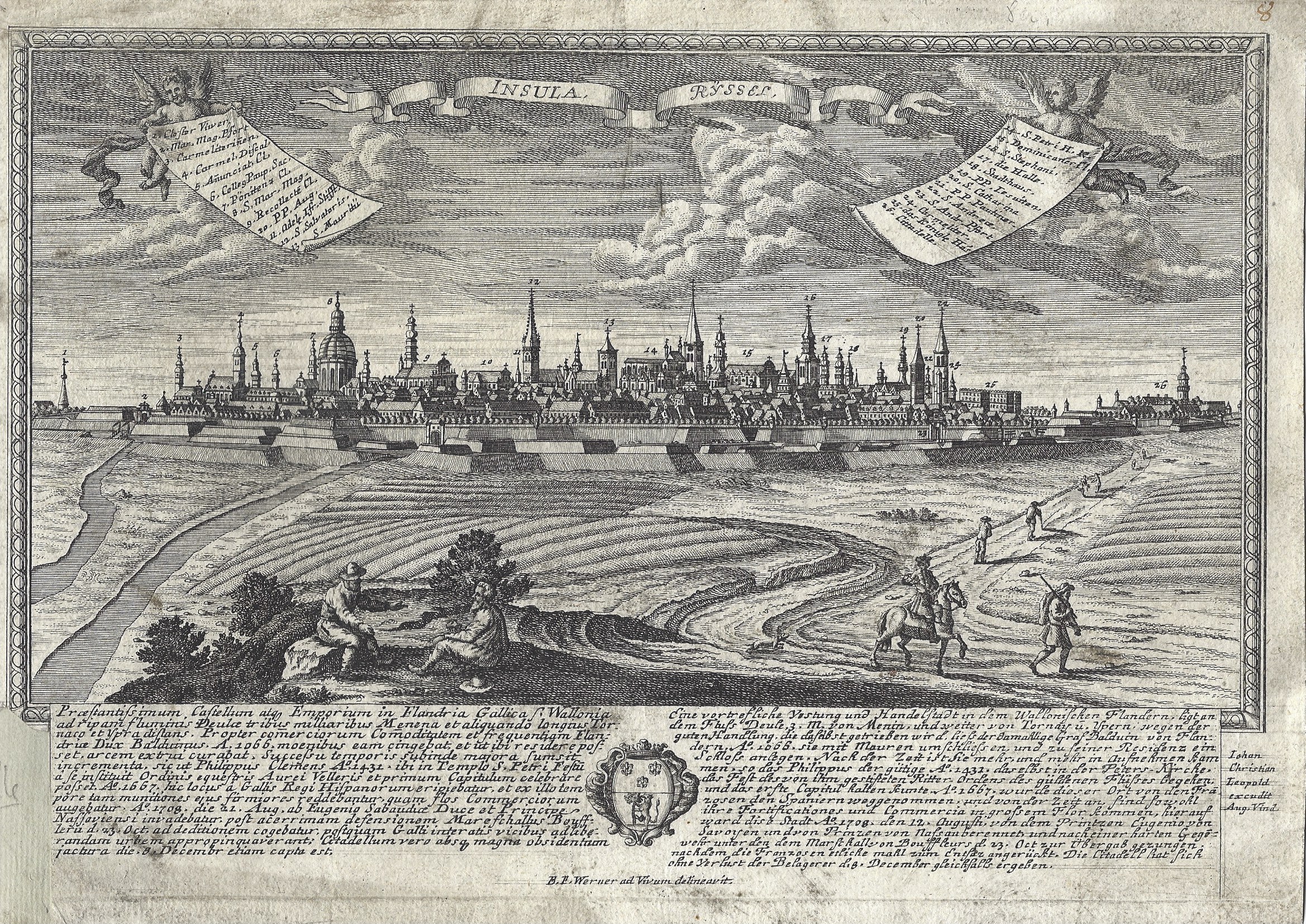- Belle vue gravée du début du XVIIIe siècle représentant "Insula Ryssel" [Lille], par B.E. Werner.