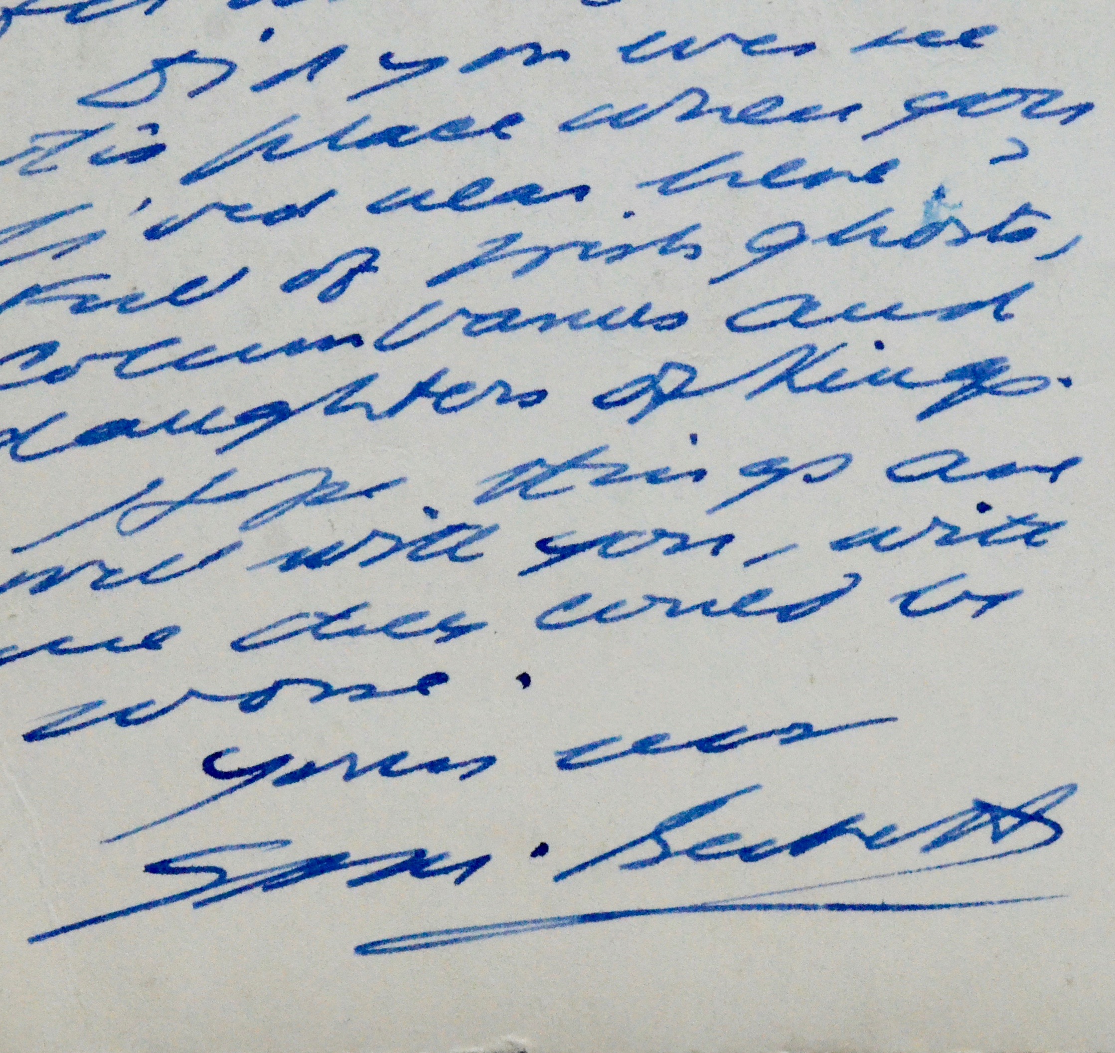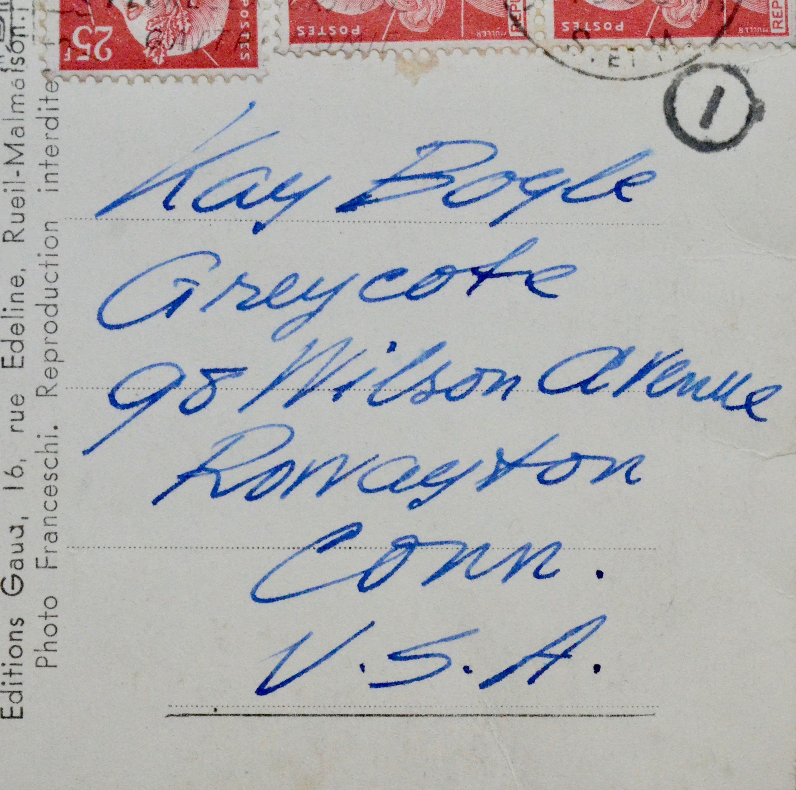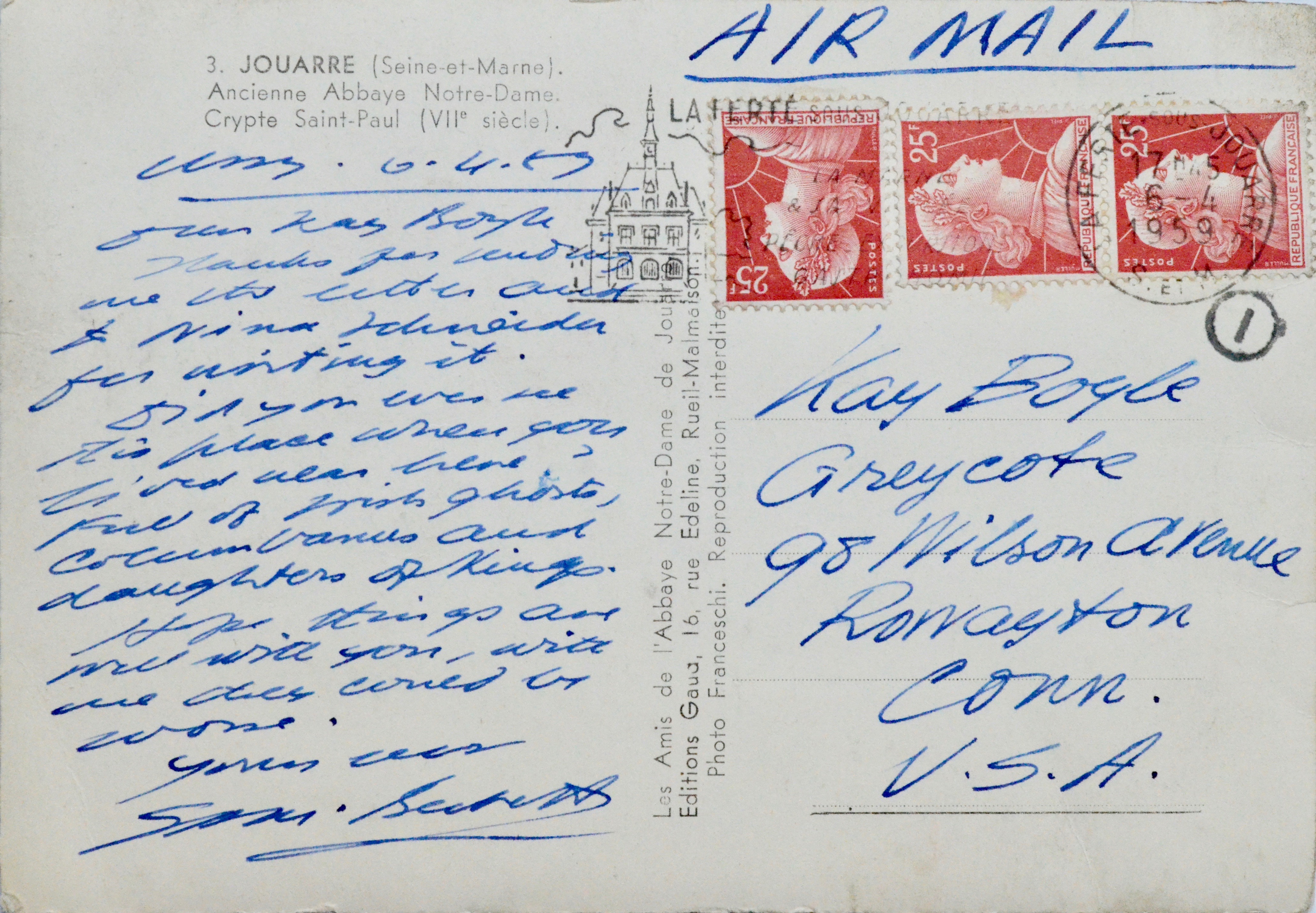 "Dear Kay Boyle. Thanks for sending me the letter and to Nina Schneider for writing it. Did you ever see this place when you lived near here ? Full of irish ghosts, columbanus and daughters of kings. Hope things are well with you, with me there comes to worse. Yours ever. Sam. Beckett". Adresse autographe en regard avec la mention "AIR MAIL".
