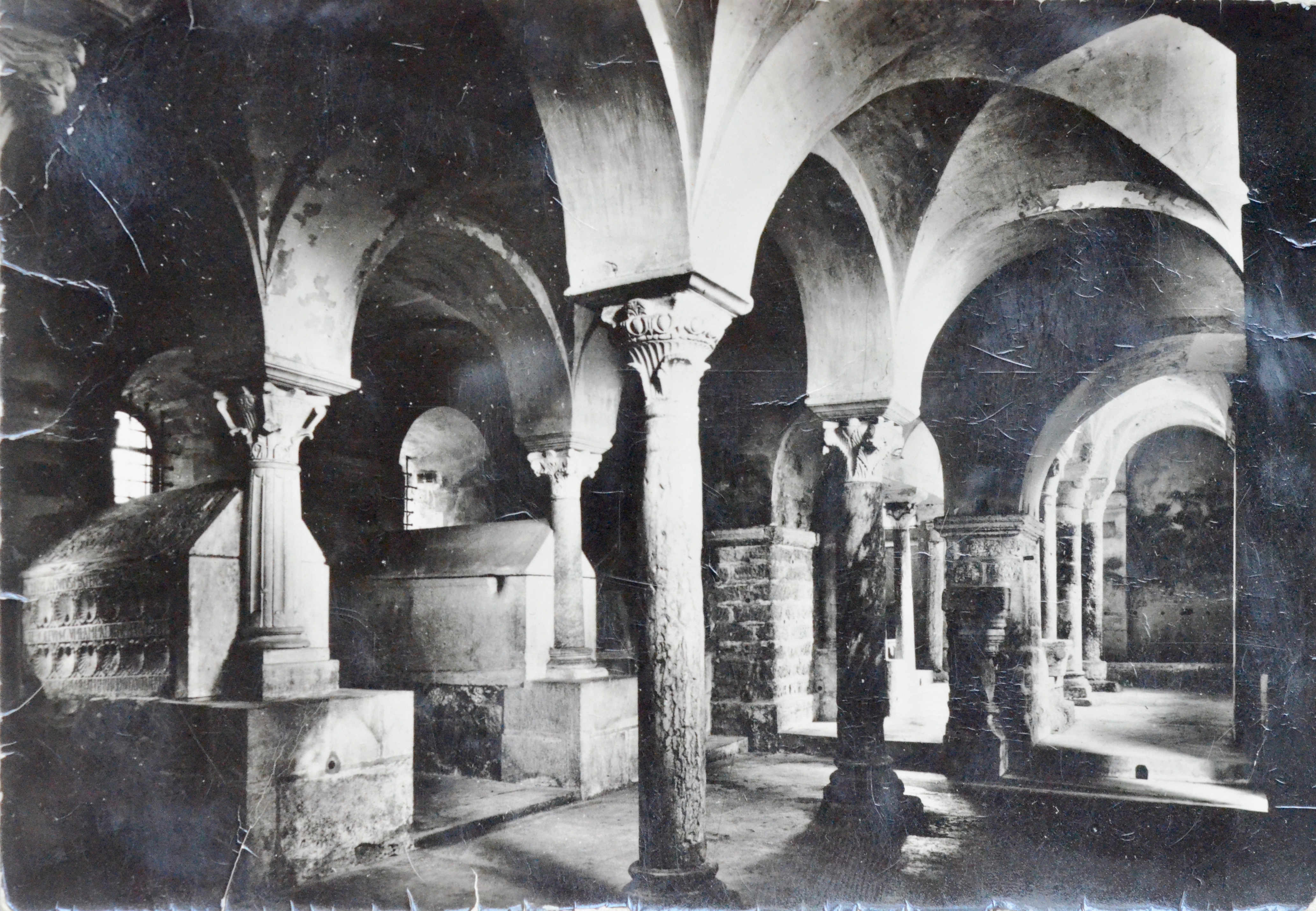 Au verso, reproduction en noir et blanc d'une photo de la crypte Saint-Paul dans l'ancienne Abbaye Notre-Dame de Jouarre.