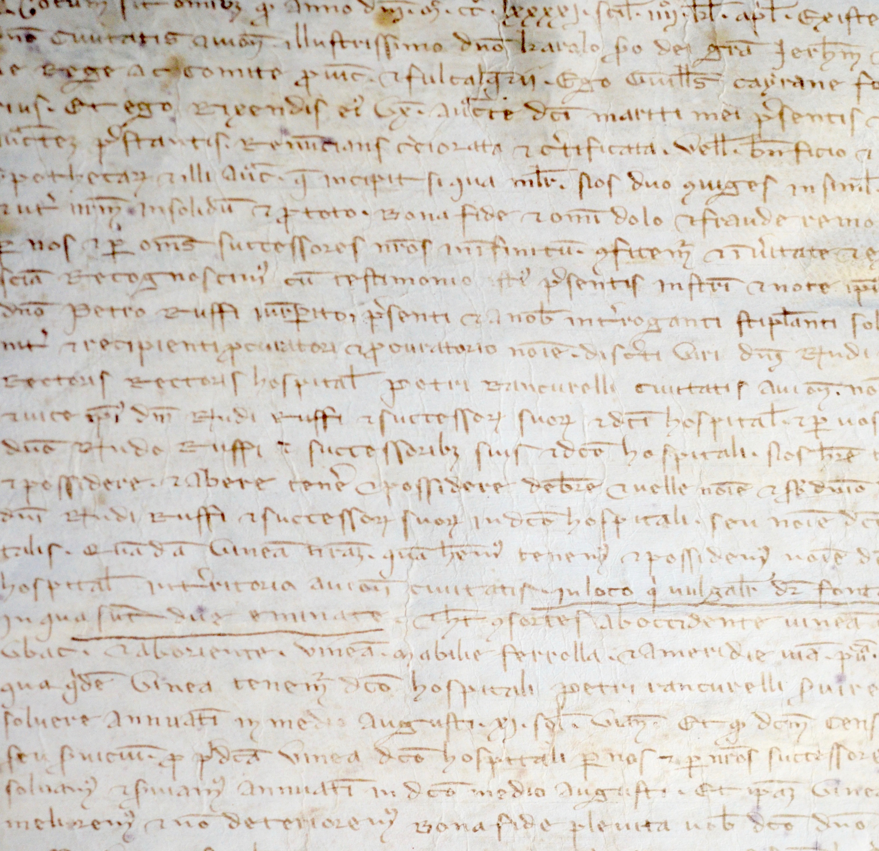Le 4 avril 1291 à Avignon, sous le règne de Charles II roi de Jérusalem et de Sicile comte de Provence et de Forcalquier, Guillaume Queyranne (Cayrane), fournier, et sa femme, reconnaissent devant Maître Pierre Roux (Petrus Ruffi) homme de loi, procureur de Bertrand Roux, recteur de l'hôtel noble (hospitale) de Pierre Rancorel, tenir en fief dudit hôtel, une pièce de vigne sise sur le territoire de la cité d'Avignon, lieu dit Fontaynas, sous le cens de 11 sous, payables à la mi-août.