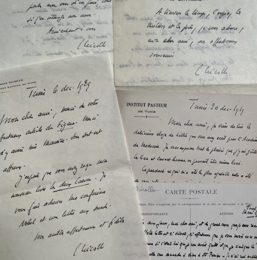 Charles Nicolle (Rouen, 1866/1936)Charmante correspondance échangée entre ces deux éminents médecins qui ont tout-deux publié des oeuvres littéraires. Nicolle, souvent ému par leur lecture, encense le talent de son confrère, notamment pour L'Eloge de Littré, Le Médecin et Les états dépressifs et la neurasthénie.